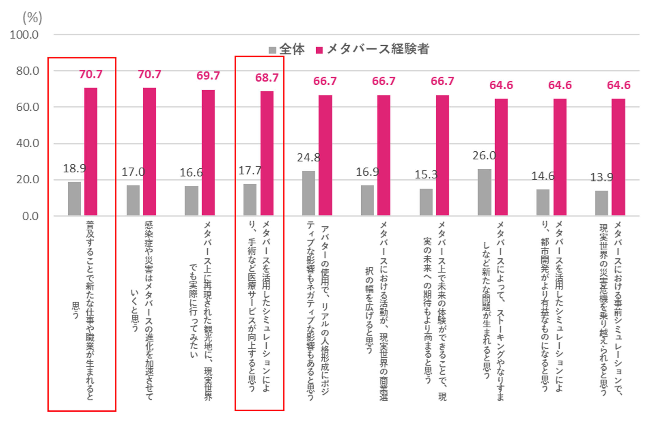 メタバースが生活や社会にもたらす影響について、調査対象者全体では「ストーキングやなりすましなど新たな問題が生まれると思う」「アバターの使用で、リアルの人格の形成にポジティブな影響もネガティブな影響もあると思う」といった不安・問題点の項目が高い一方、メタバース経験者では「普及することで新たな仕事や職業が生まれると思う」「シミュレーションによって、手術など医療サービスが向上すると思う」といったプラスの影響に関する項目が非常に高く、メタバースの可能性を信じていることがうかがえます。