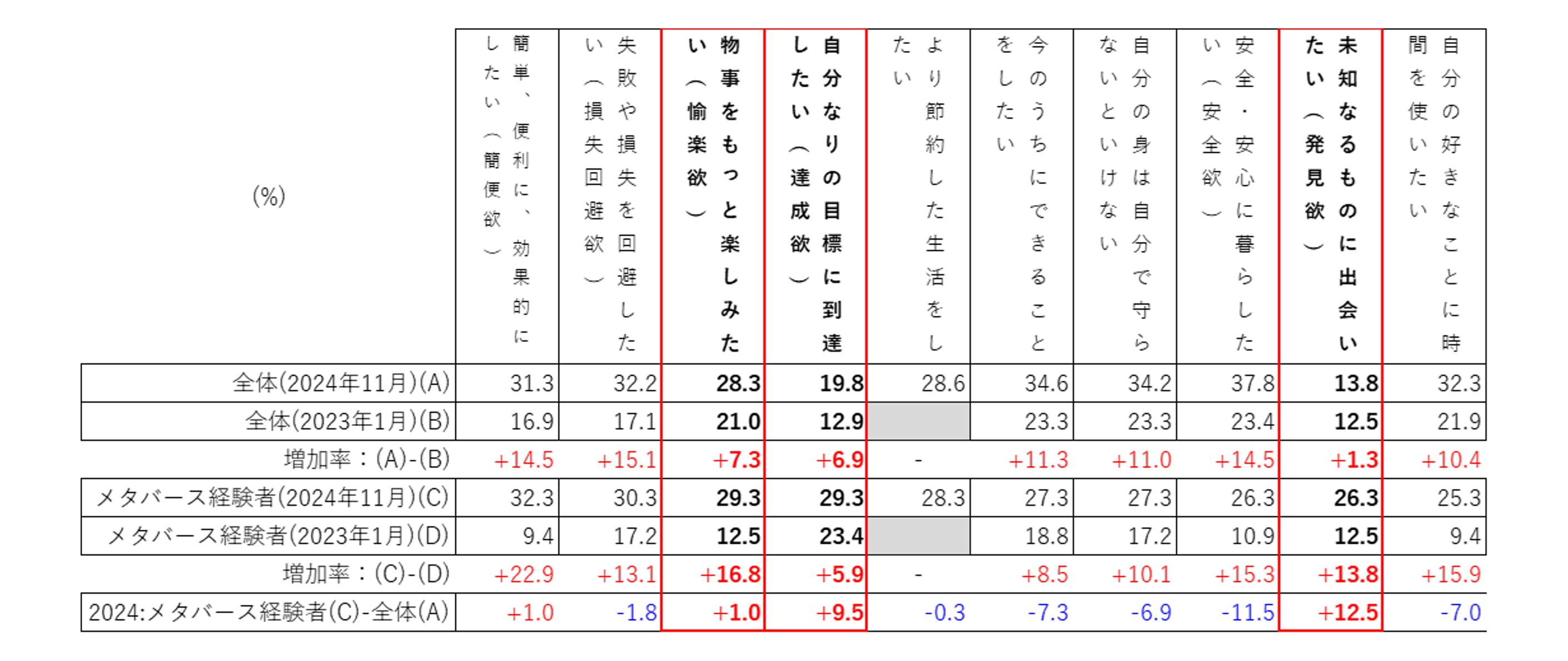「12欲求」を含む、今後強くなりそうな意識についてきいたところ、調査対象者全体では「自分の身は自分で守らないといけない」など、安心・安全や万が一に備える意識に関する項目が高く出た一方、メタバース経験者では「物事をもっと楽しみたい(愉楽欲)」「自分なりの目標に到達したい(達成欲)」「未知なるものに出会いたい(発見欲)」といった前向きな意識の項目が上位となっており、情報過多や先行き不安の中でも積極的な姿勢を持っていることがうかがえます。