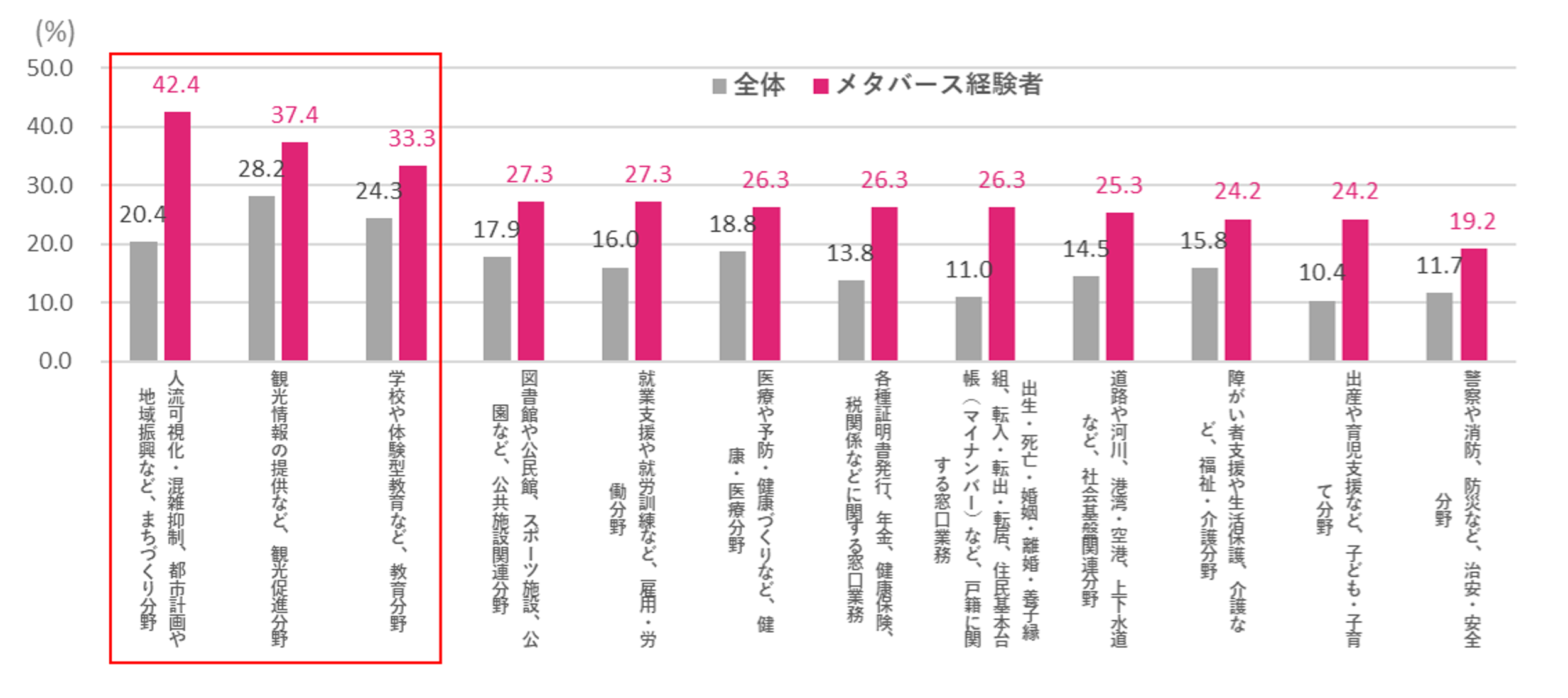 さまざまな公共サービス領域におけるメタバース活用への期待についてきいたところ、いずれの項目でもメタバース経験者が目立って高く、特に「まちづくり分野」「観光促進分野」「教育分野」の値が高くなりました。