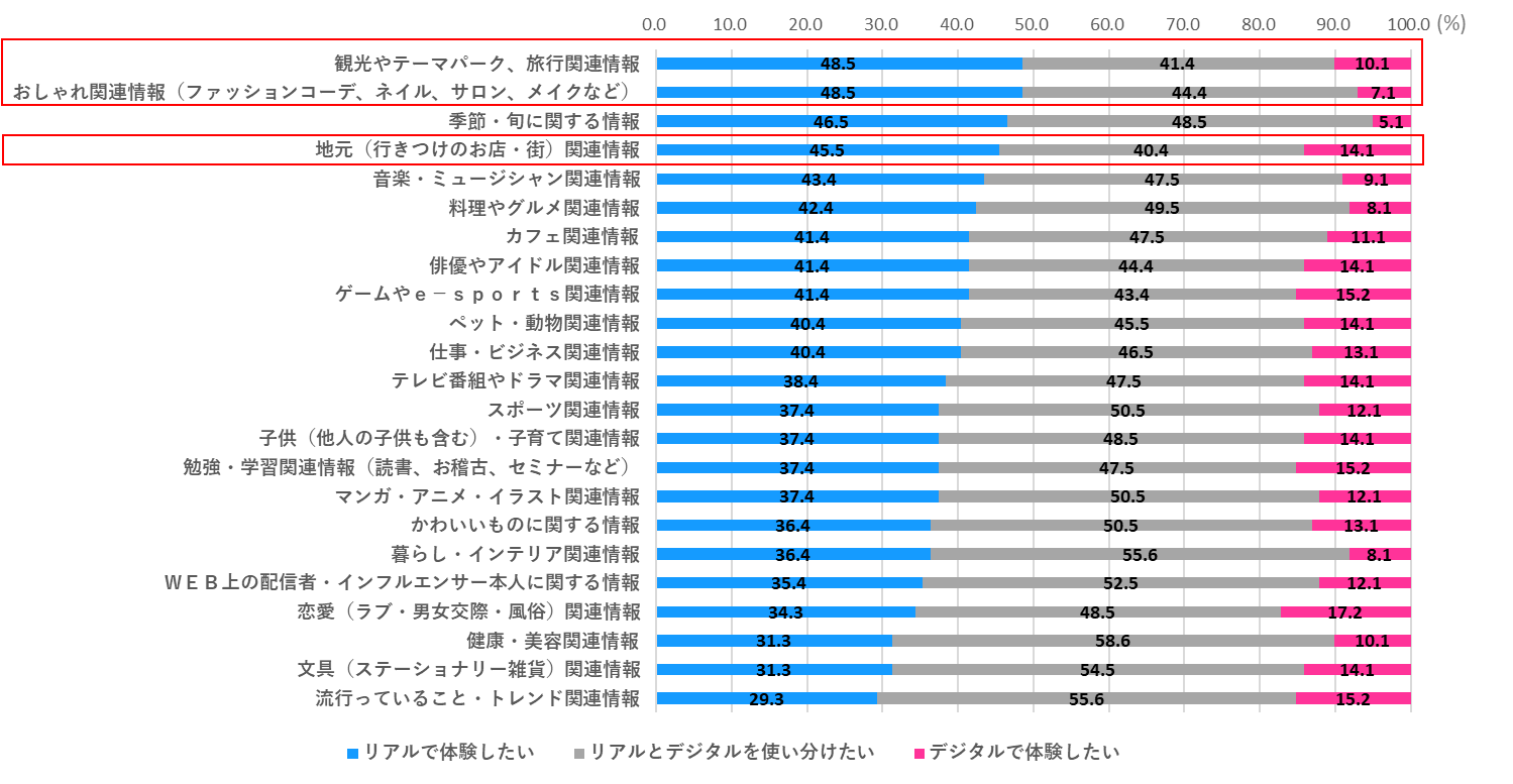 メタバース経験者は、すべてデジタル上で完結させたいわけではなく、ジャンルや場面によって「リアルとデジタルを使い分けたい」と考えていることが分かりました。なお「観光やテーマパーク、旅行関連情報」「おしゃれ関連情報」「地元(行きつけのお店・街)関連情報」の3項目においては「リアルとデジタルを使い分けたい」よりも「リアルで体験したい」が高くなっており、体験・ファッションなどの没入感・臨場感に関わる領域では「リアルのほうが良い」という感覚がある人が多いことがうかがえます。