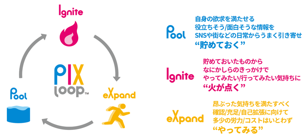 博報堂行動デザイン研究所は、彼らは“情報行動”と“消費行動”を明確に区別しておらず、『Pool (情報を引き寄せ貯めておく)』⇒『Ignite (気持ちに火が点く)』⇒『eXpand (体験をやってみて情報圏を拡げる)』という行動をループさせながら自己充足を図っていることを発見、次世代型行動デザインモデル「PIXループ™」を開発いたしました。この生活者主体の情報/体験行動ループの中に、いかに企業/ブランドが入り込み、消費(購買/契約)行動に結びつく施策をプロットしていけるかがこれからのマーケティングの成否を握ると考えます。