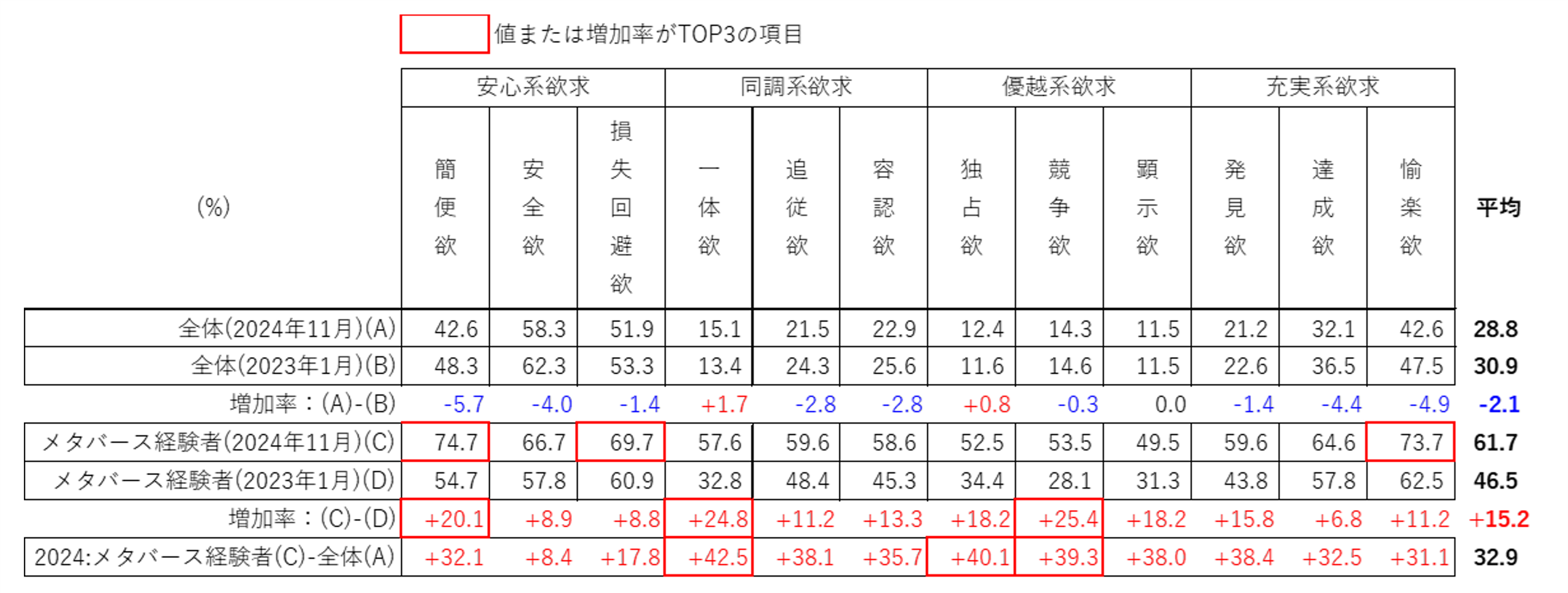 当研究所が定義した、情報を引き寄せ貯めこむ行動(情報プール)や気持ちの発火の元となる「12欲求(参考資料9参照)」を持っているかどうかについて、今回調査(2024年11月)の値とコロナ禍での調査(23年1月実施)との差を調査対象者全体・メタバース経験者別でみると、全体平均は28.8%(前回差-2.1pt)となった一方、メタバース経験者平均では61.7%(前回差+15.2pt)と非常に高い値となりました。特に全体では低い、独占・競争を求める「優越系欲求」や周囲からの容認・一体感を求める「同調系欲求」が高く、人との競争や関わりへの意欲の高さがうかがえます。