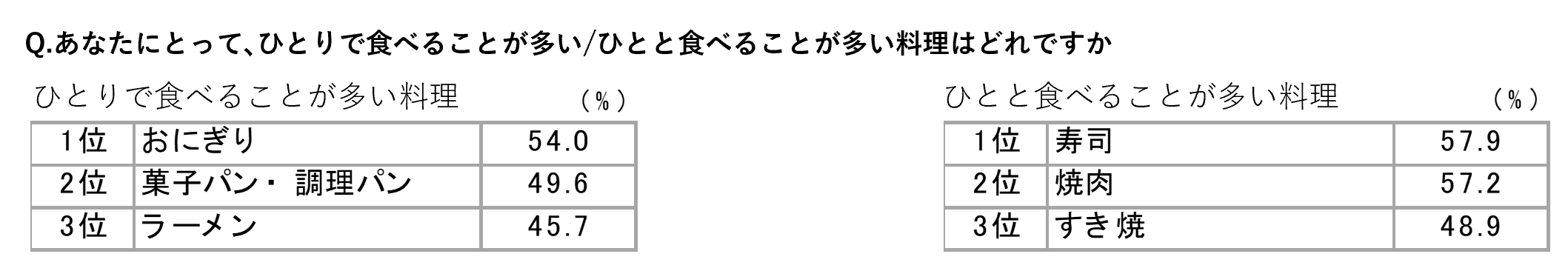 ひとりで食べることが多い調理では「主“食”メイン料理」(おにぎり、パン、ラーメン)、ひとと食べることが多い料理では、魚と肉などの「主“菜”メイン料理」(寿司、焼肉、すき焼)が上位。食事スタイルごとに料理も異なっています。