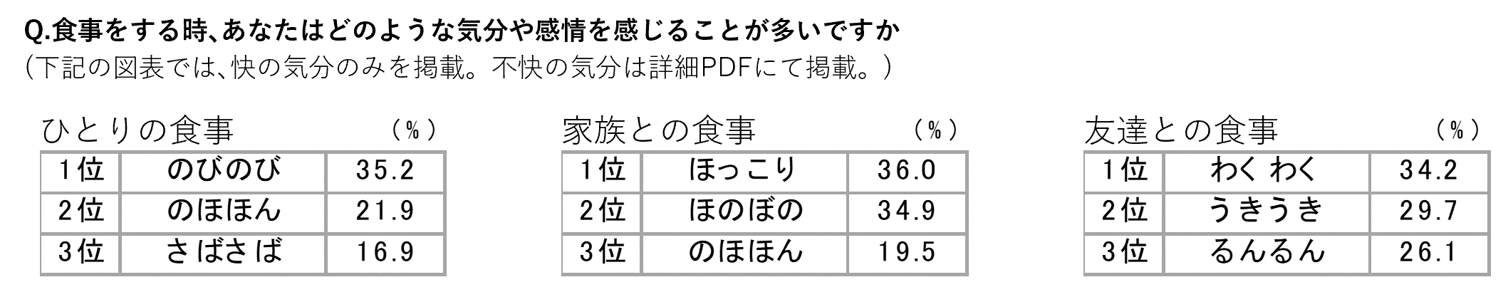食事の気分をオノマトペで選んでもらったところ、「ひとりの食事」は“のびのび”、「家族との食事」は“ほっこり”、「友だちとの食事」は“わくわく”が1位。食事スタイルごとに得られる快の気分が異なることがわかりました。
