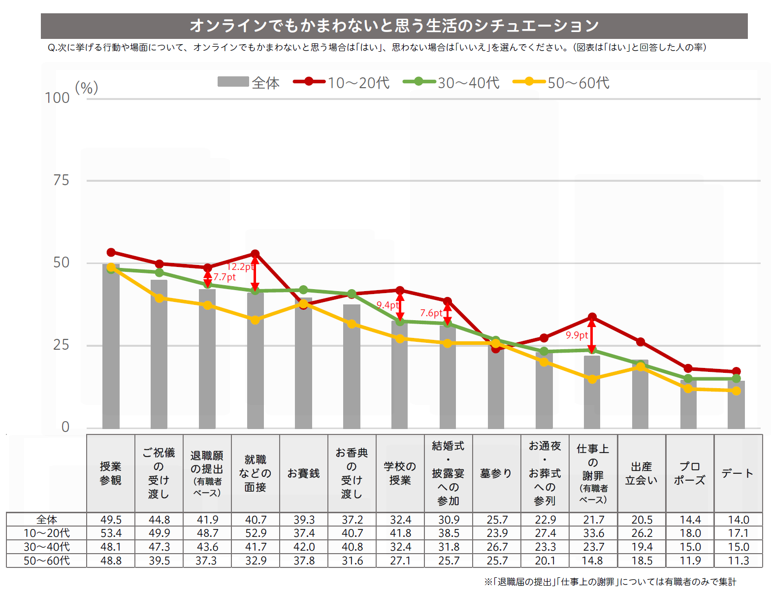 「授業参観」「ご祝儀の受け渡し」「退職願」「就職面接」は4割以上が「オンラインでもかまわない」。