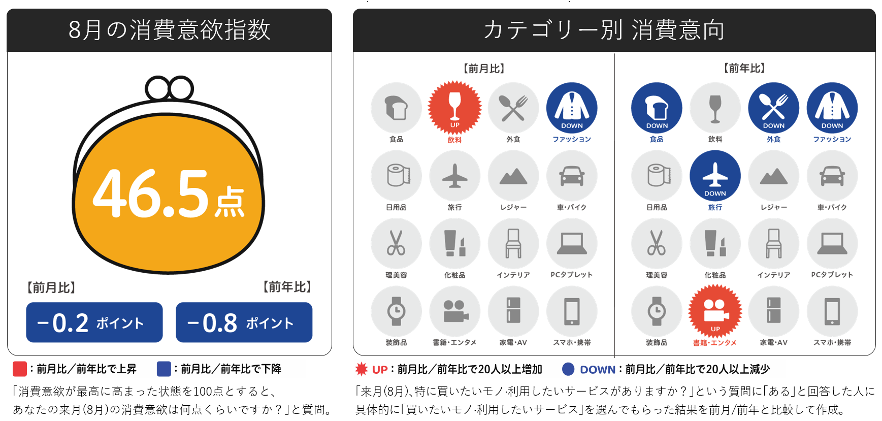 夏休みシーズンに入るも、物価高や酷暑の影響で消費意欲指数は8月のなかで過去最低値。消費意向は「旅行」などで前年比減