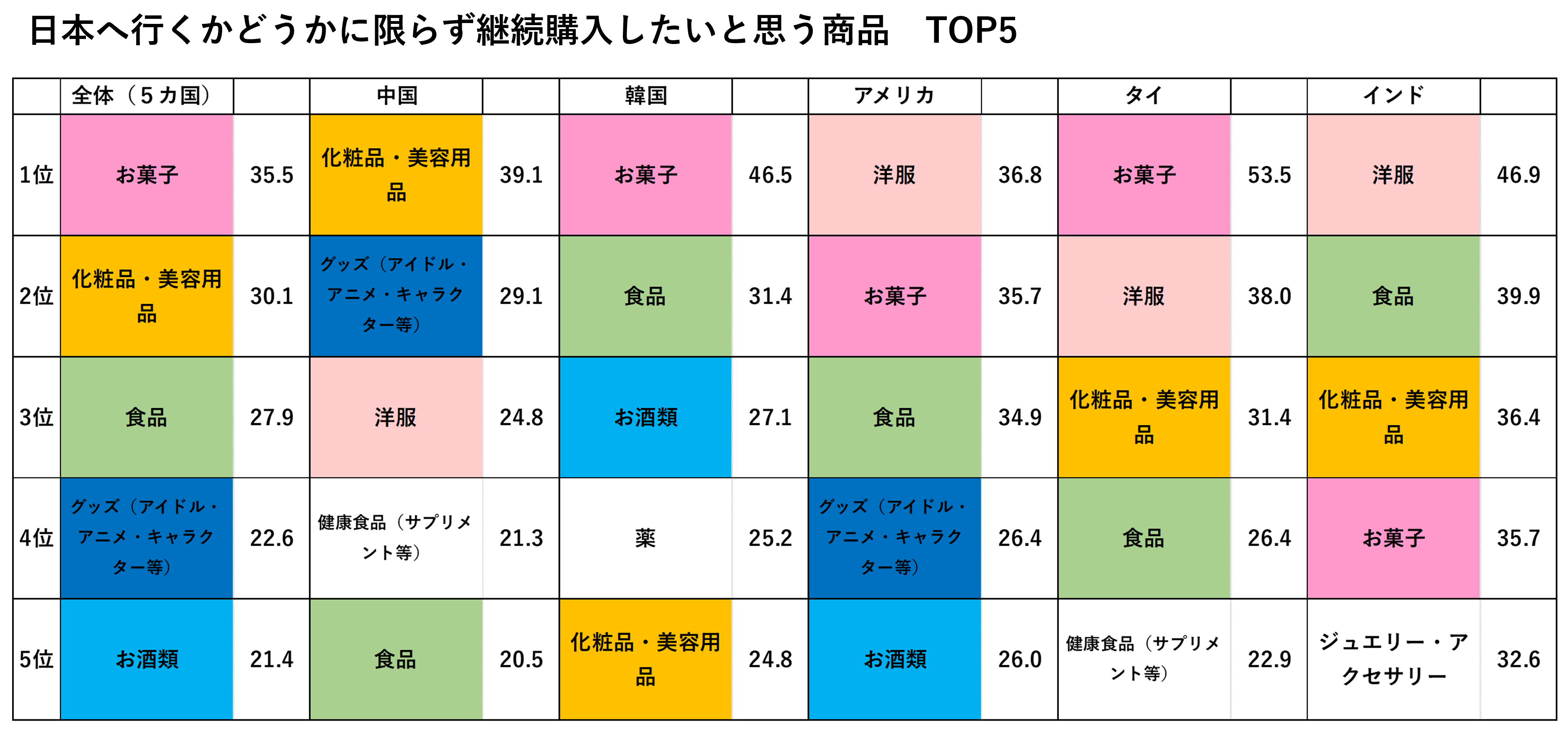 - 国別にも特徴があり、中国は化粧品(39.1%)、グッズ(29.1%)、洋服(24.8%)。韓国はお菓子(46.5%)、食品(31.4%)、お酒(27.1%)。アメリカは洋服(36.8%)、お菓子(35.7%)、食品(34.9%)。タイはお菓子(53.5%)、洋服(38.0%)、化粧品・美容用品(31.4%)。インドは洋服(46.9%)、食品(39.9%)、化粧品(36.4%)となる。