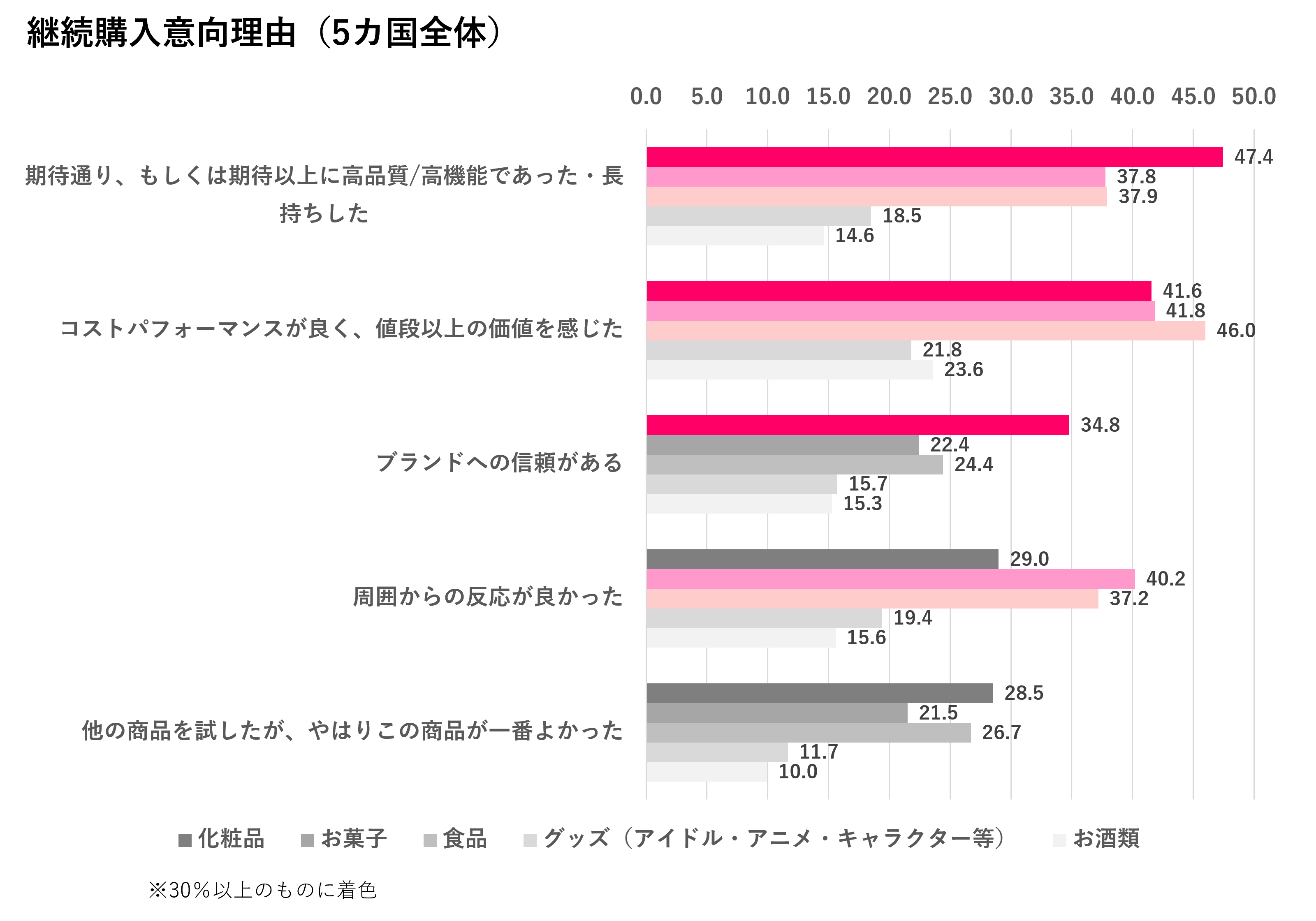 日本へ行くかどうかに限らず帰国後も継続購入したいと思う商品について、5カ国全体では、お菓子、化粧品・美容用品、食品、グッズ(アイドル・アニメ・キャラクター等)、お酒が比較的高く、次いで健康食品、洋服、薬が並ぶ。継続購入したい理由としては、化粧品・美容用品、洋服、お菓子などは品質、お菓子、洋服はコスパの良さなどが評価され継続利用意向が高くなっている。