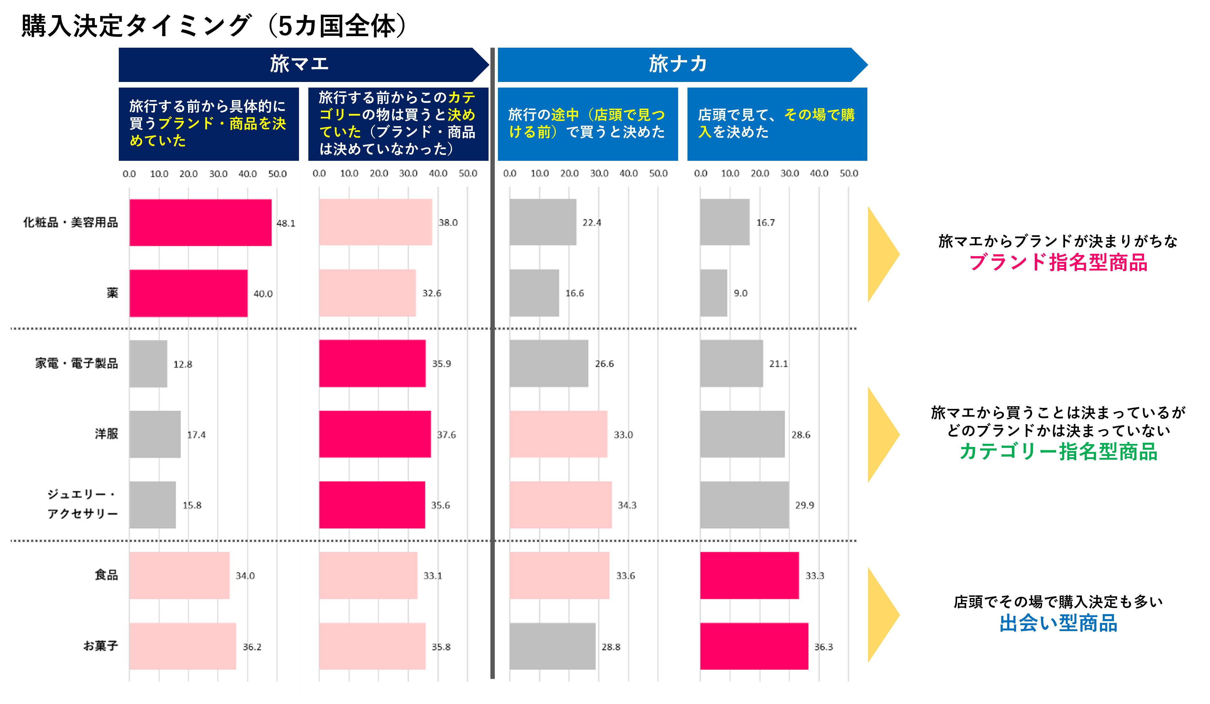 旅マエから購入を決定する「ブランド指名型商品」、旅ナカで決定する「カテゴリー指名型商品」「出会い型商品」の特性理解が重要