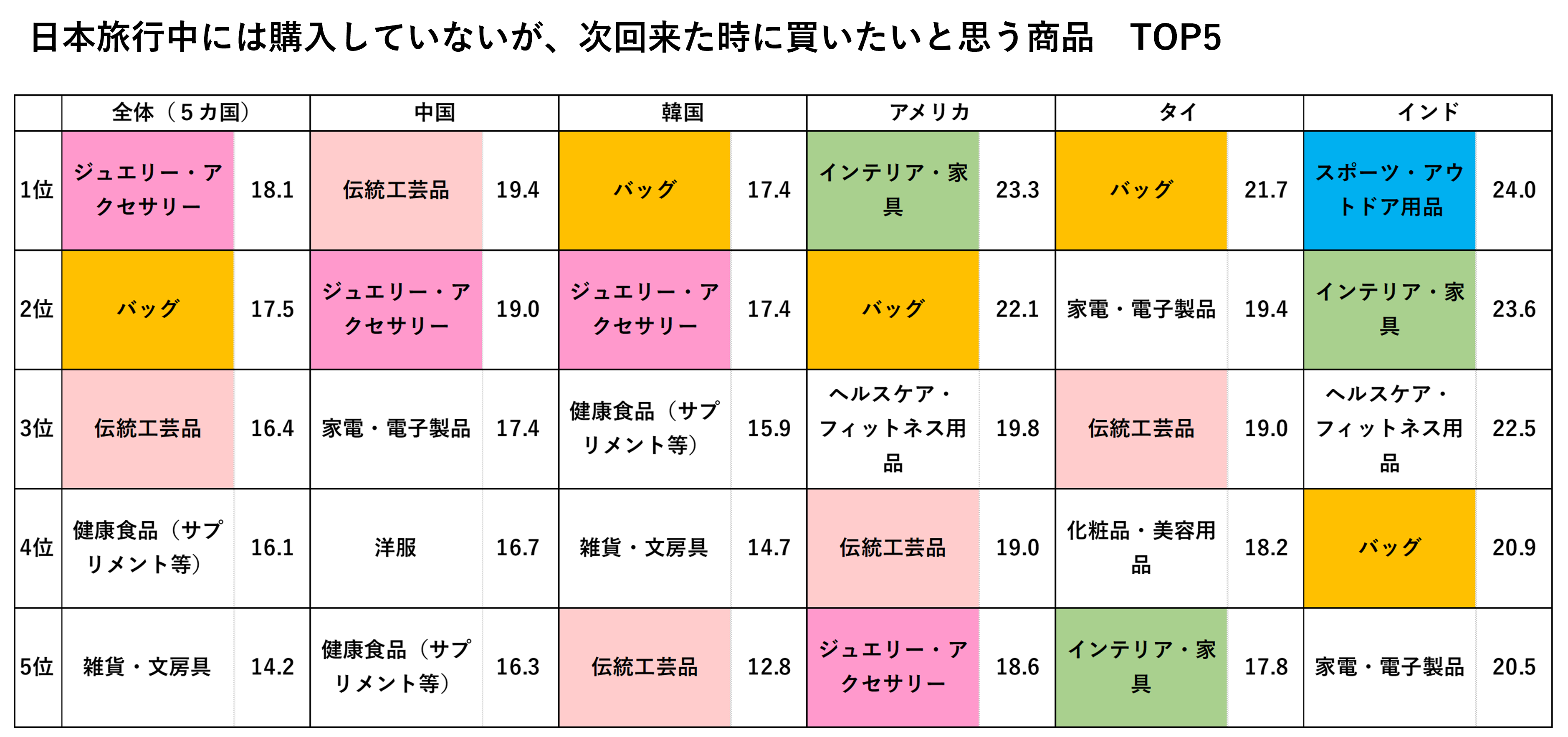 - 国別にみると、中国では伝統工芸品(19.4%)、ジュエリー・アクセサリー(19.0%)、家電・電子製品(17.4%)。韓国はバッグ(17.4%)、ジュエリー・アクセサリー(17.4%)、健康食品(15.9%)。アメリカ顧客はインテリア家具(23.3%)、バッグ(22.1%)、ヘルスケア・フィットネス用品(19.8%)。タイ顧客はバッグ(21.7%)、家電・電子製品(19.4%)、伝統工芸品(19.0%)。インド顧客はスポーツアウトドア用品(24.0%)、インテリア家具(23.6%)、ヘルスケア・フィットネス用品(22.5%)が高く、前回日本で購入したものとは異なる新たなカテゴリーにも関心が高まっていることがわかる。