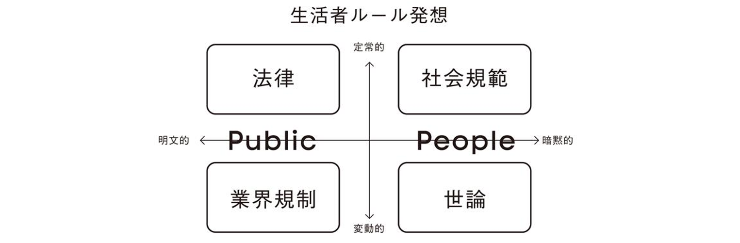 「Creative PA」の最大の特徴は、博報堂独自の「生活者ルール発想」です。従来のPAは、主に「法律」や「業界規制」といった『Publicルール』が対象とされてきました。これに対し「Creative PA」では、『Publicルール』だけでなく「社会規範」や「世論」といった『Peopleルール』までを包括的に捉え、両軸にアプローチする「生活者ルール発想」に基づいたクライアントの支援を行います。
