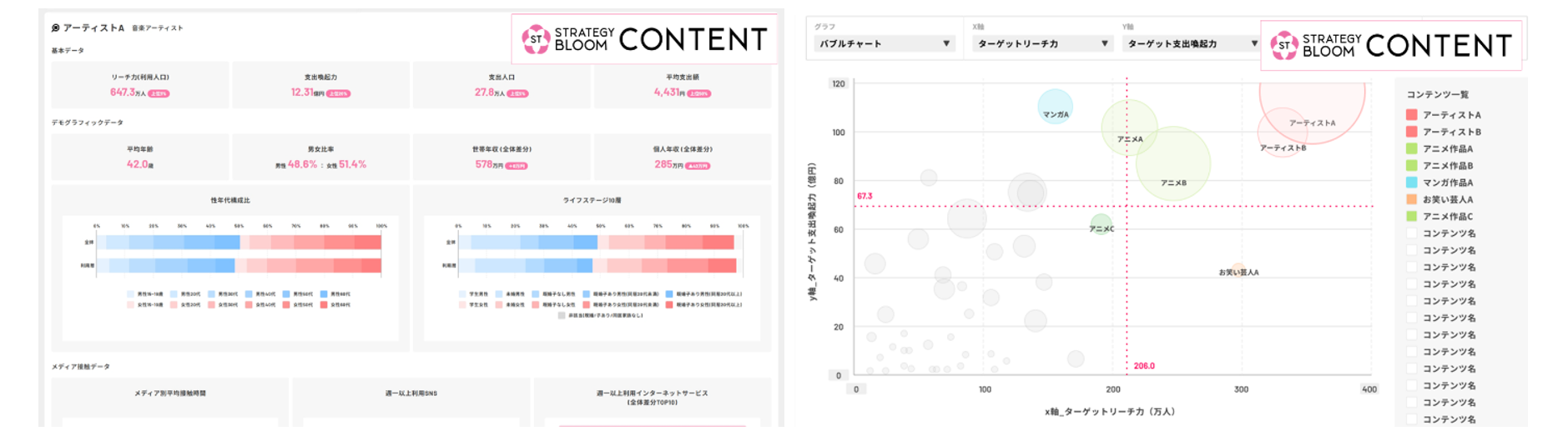 直近一年間に購入した耐久財やサービス、保有デバイス・利用しているネットサービス・よく利用するメディア、週一回以上訪れる店舗など、ファンのコンテンツ利用以外の行動を組み合わせた分析ができるほか、バブルチャートなどのグラフで可視化しながらコンテンツ間の比較も可能です。