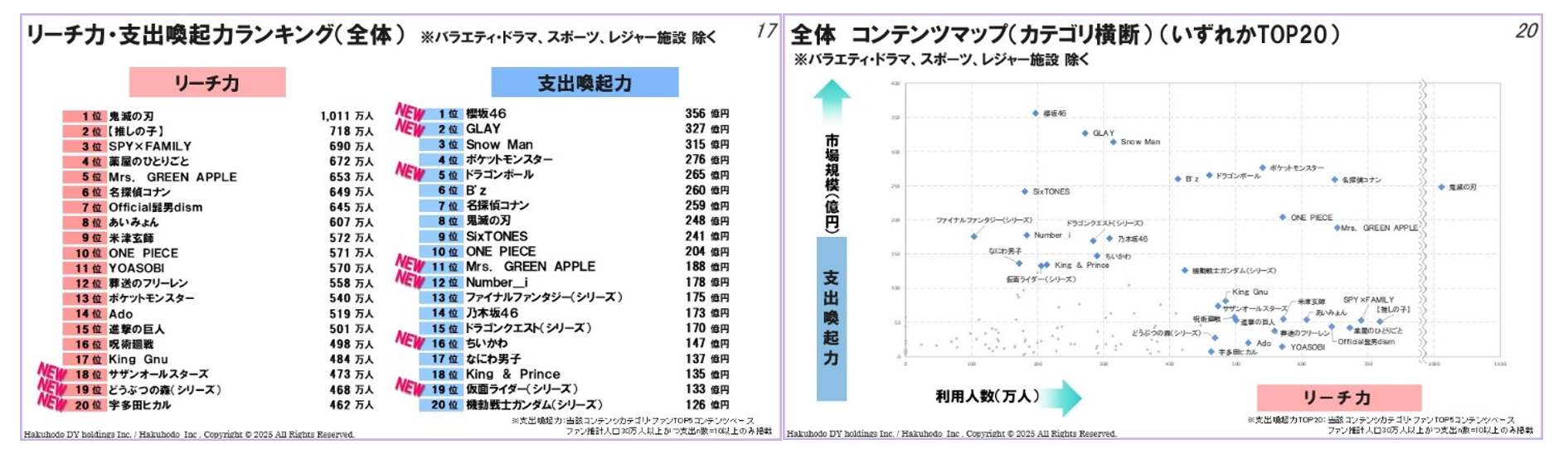 株式会社博報堂DYホールディングスと株式会社博報堂の共同研究プロジェクト「コンテンツビジネスラボ」は、「コンテンツファン消費行動調査2025」を実施し、そのデータをもとにアニメや音楽など全11カテゴリ・計1,700以上のコンテンツに関する、「リーチ力・支出喚起力※ランキング」を算出しました。