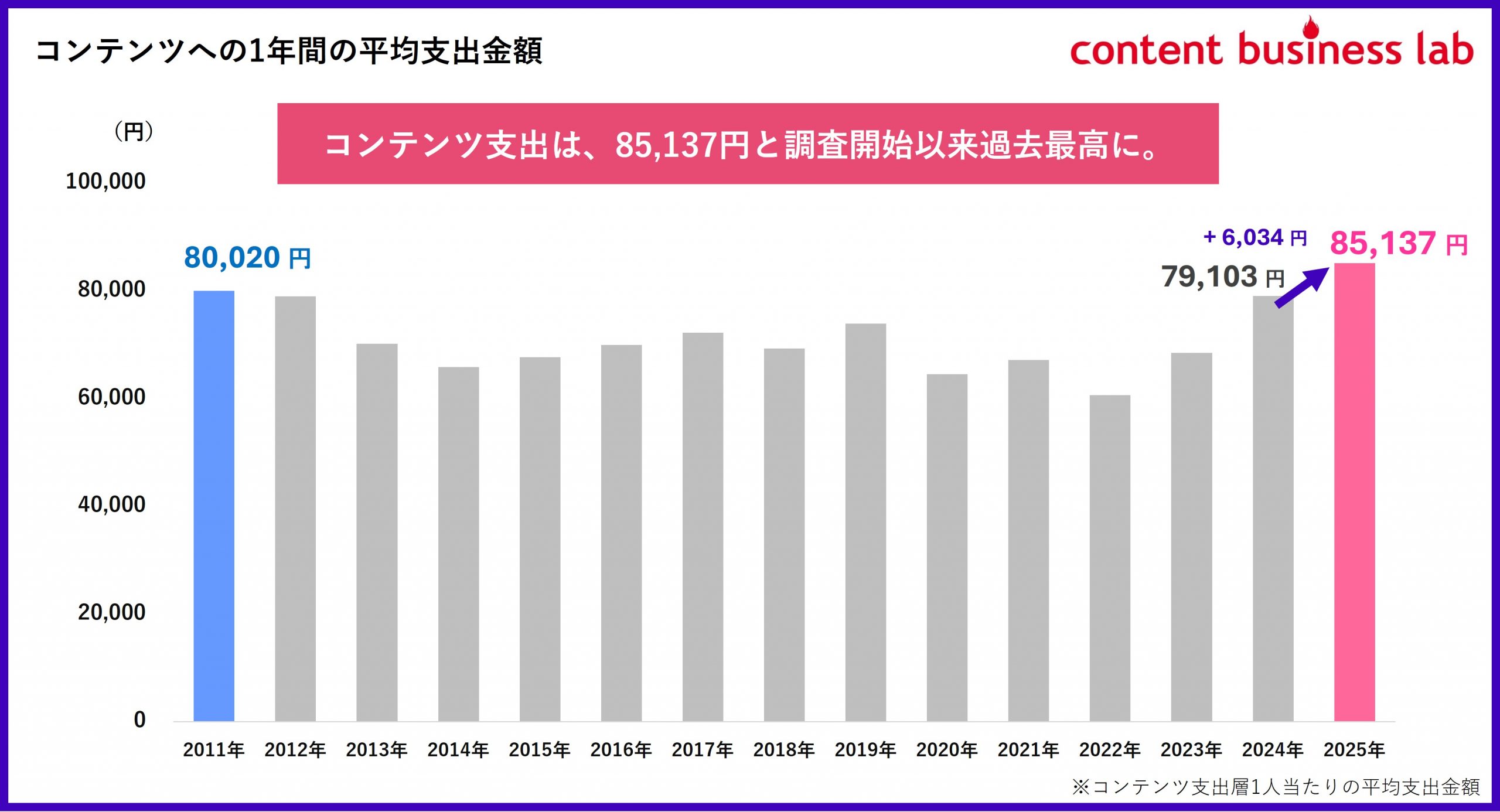 生活者のコンテンツへの支出金額は85,137円(前年比+6,034円)と、2011年の調査開始以来、過去最高を記録しました。コロナ禍で落ち込んだところから、2023年調査以降3年連続の上昇となり、エンターテインメント市場の本格的な盛り上がりを示しています。