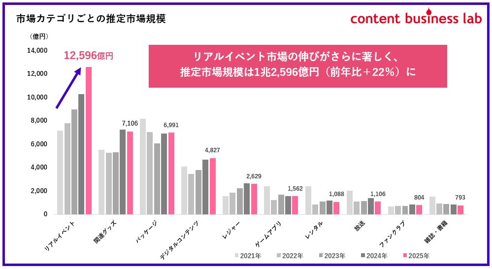 市場カテゴリごとに見ると、これまでも拡大を続けていたリアルイベント市場の伸びがさらに著しく、推定市場規模は1兆2,596億円(前年比+22%)に達しました。また、前年調査で大幅に拡大した関連グッズ市場(7,106億円)やデジタルコンテンツ市場(4,827億円)も引き続き高い水準です。
