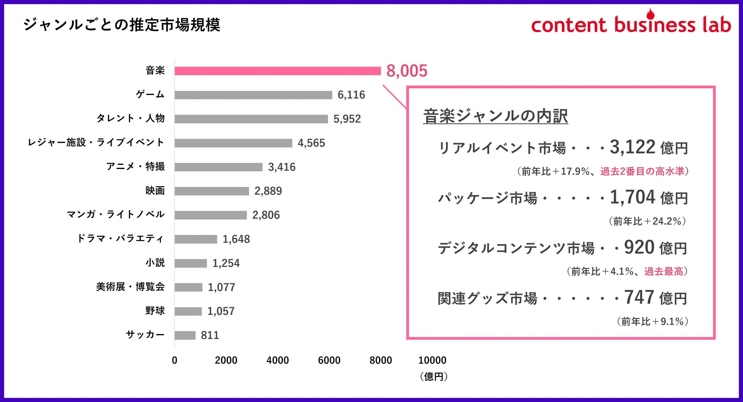 コンテンツジャンルごとに見ると、音楽ジャンルが最大の市場規模(8,005億円)で、全体の支出増を牽引しています。特に、コンサートや音楽フェスティバルなどのリアルイベント市場(3,122億円)は調査開始以来2番目の高水準となったほか、デジタルコンテンツ市場(920億円)は過去最高を記録。関連グッズ市場(747億円)も高水準を維持しており、調査全体のトレンドを象徴する形で市場を押し上げています。