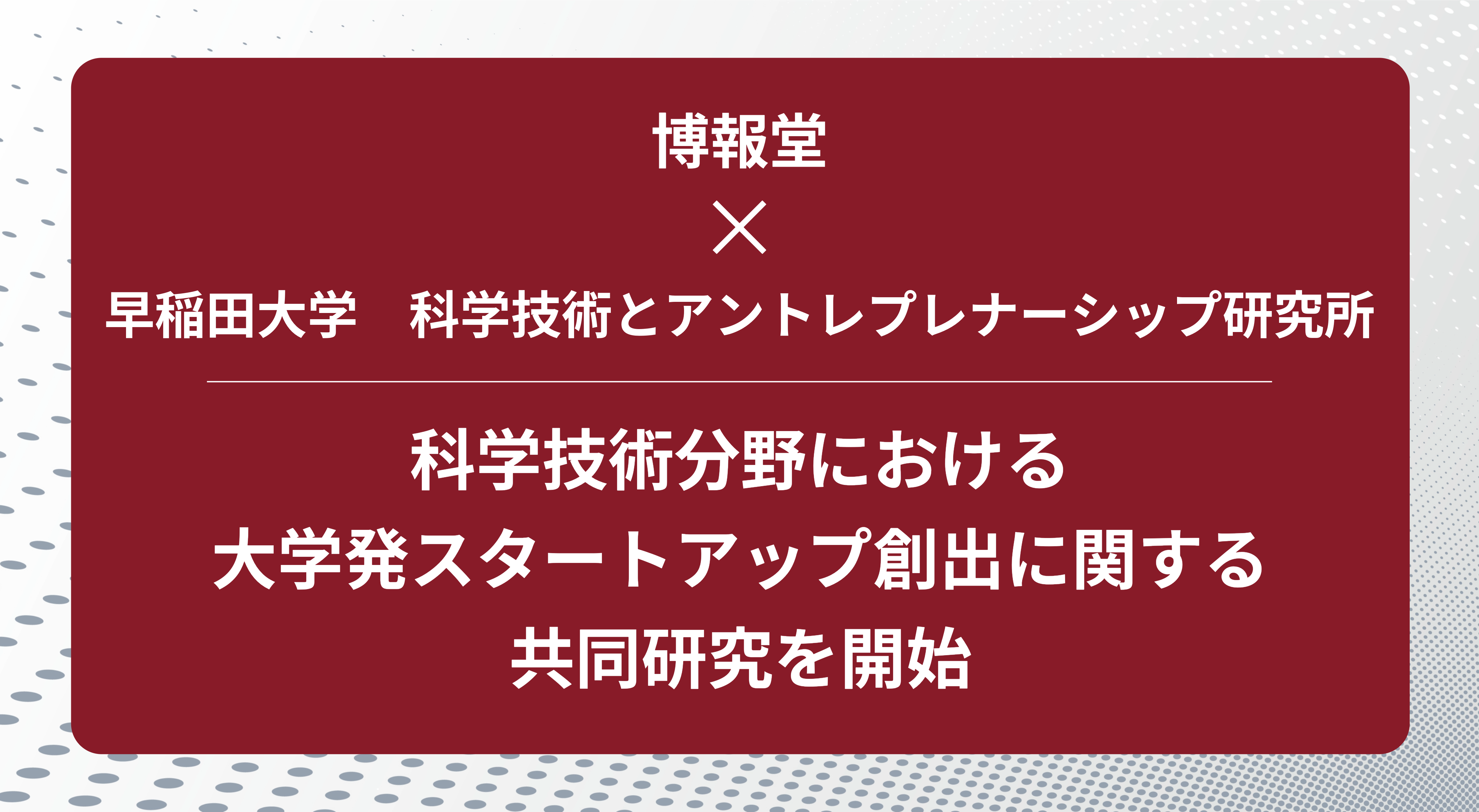 株式会社博報堂(本社:東京都港区、代表取締役社長:名倉健司、以下 博報堂)の新規事業開発を担うミライデザイン事業ユニットは、早稲田大学大学院経営管理研究科(ビジネススクール) 牧 兼充(まき・かねたか)准教授(早稲田大学総合研究機構 科学技術とアントレプレナーシップ研究所所長)の研究室と、大学発スタートアップの創出に関する共同研究を開始しました。