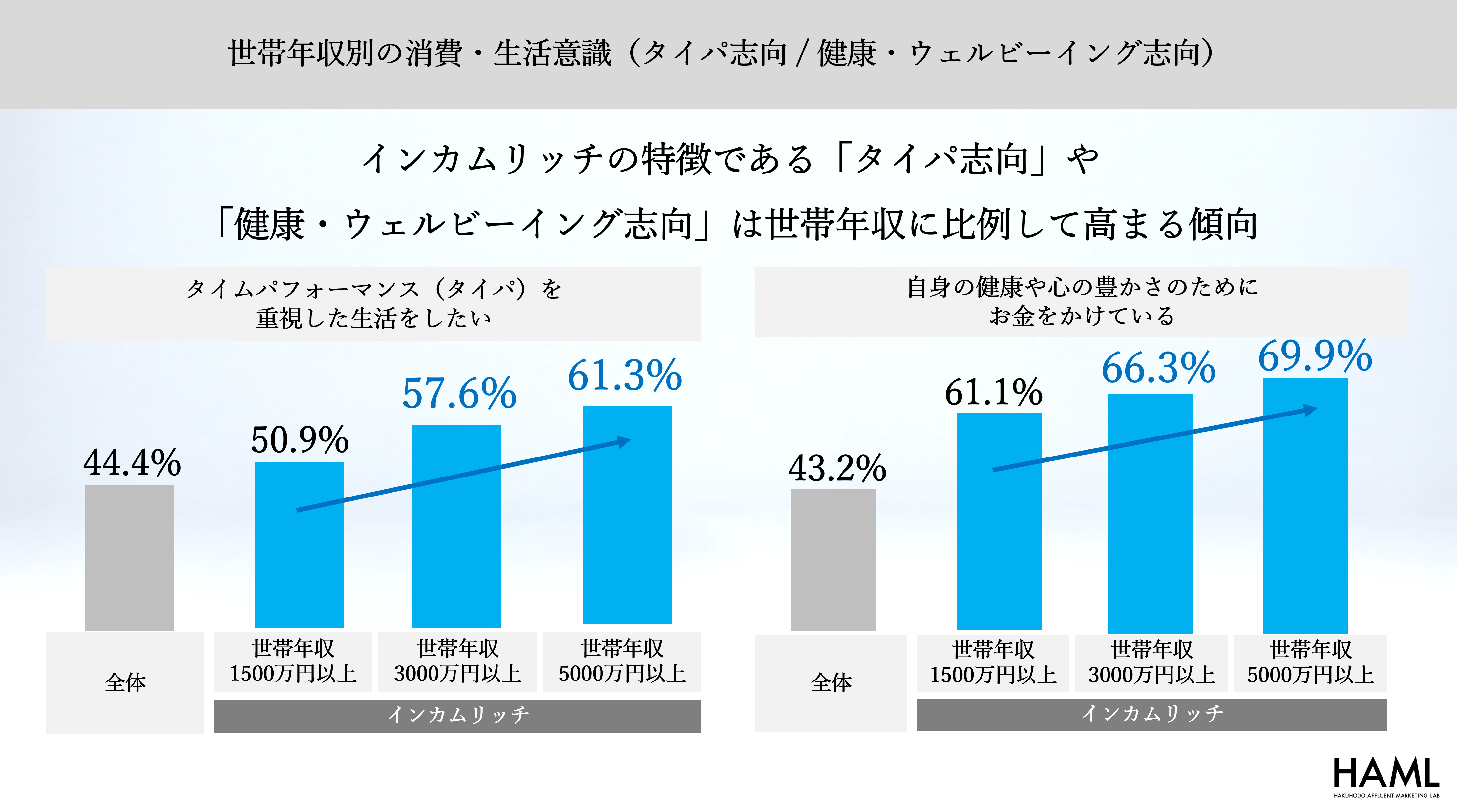 ■前回調査でも見られたインカムリッチの特徴である「タイパ志向」や「健康・ウェルビーイング志向」は世帯年収に比例して高まる傾向。