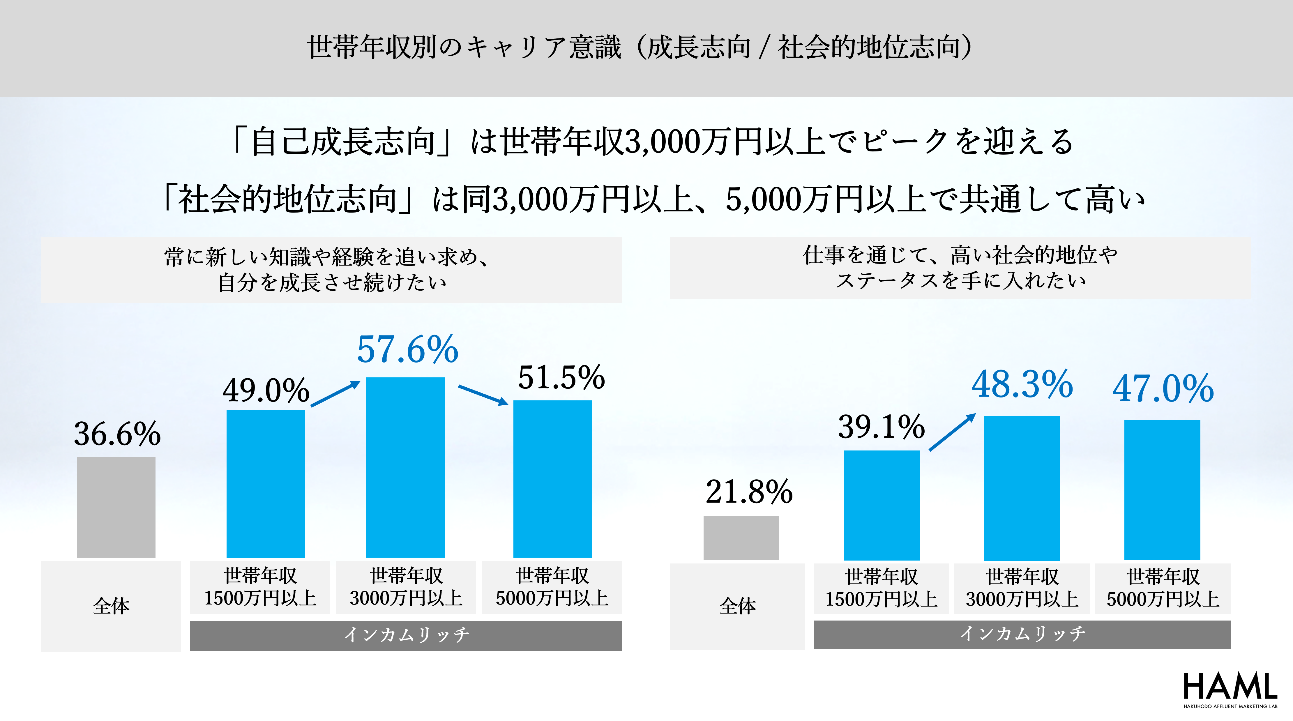 - キャリア意識では「常に新しい知識や経験を追い求め、自分を成長させ続けたい」意識は世帯年収3,000万円以上(57.6%)で最も高く、同5,000万円以上(51.5%)ではやや低下。