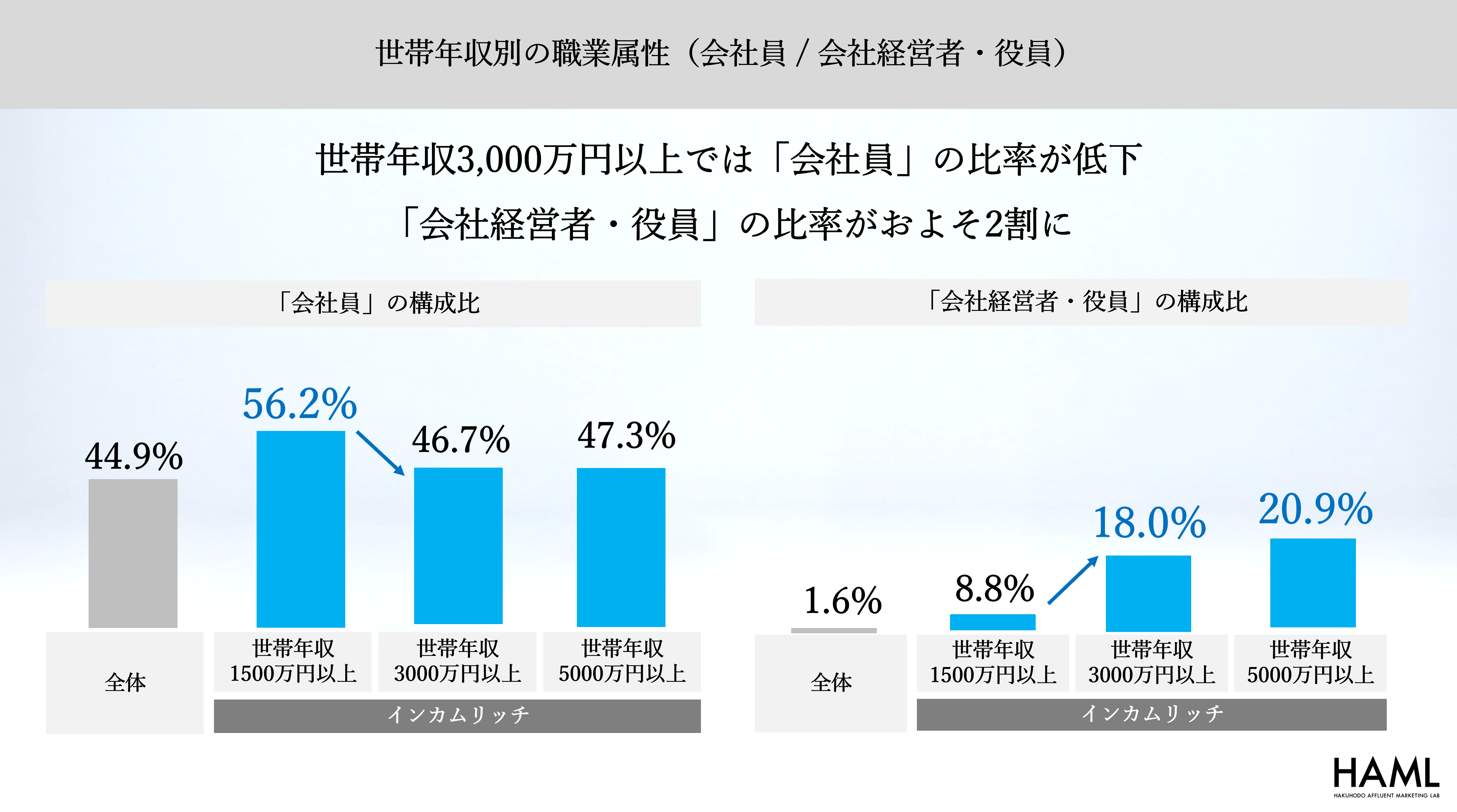 - 職業が「会社経営者・役員」の比率は世帯年収1,500万円以上(8.8%)に対し、同3,000万円以上(18.0%)、同5,000万円以上(20.9%)と世帯年収3,000万円以上を境に増加する傾向が見られた。
