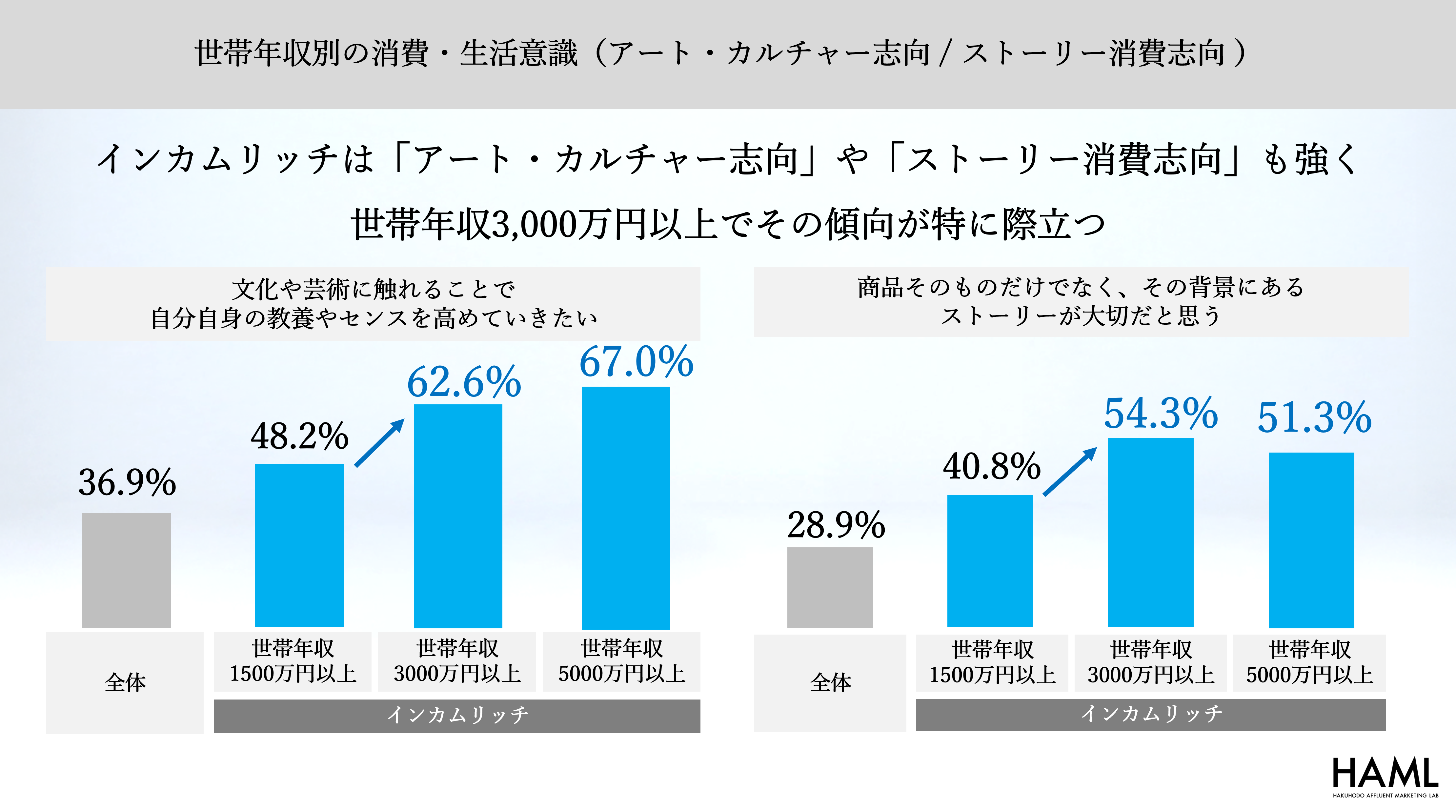 - インカムリッチは「アート・カルチャー志向」や「ストーリー消費志向」も強く、世帯年収3,000万円以上で特に際立つ結果となった。