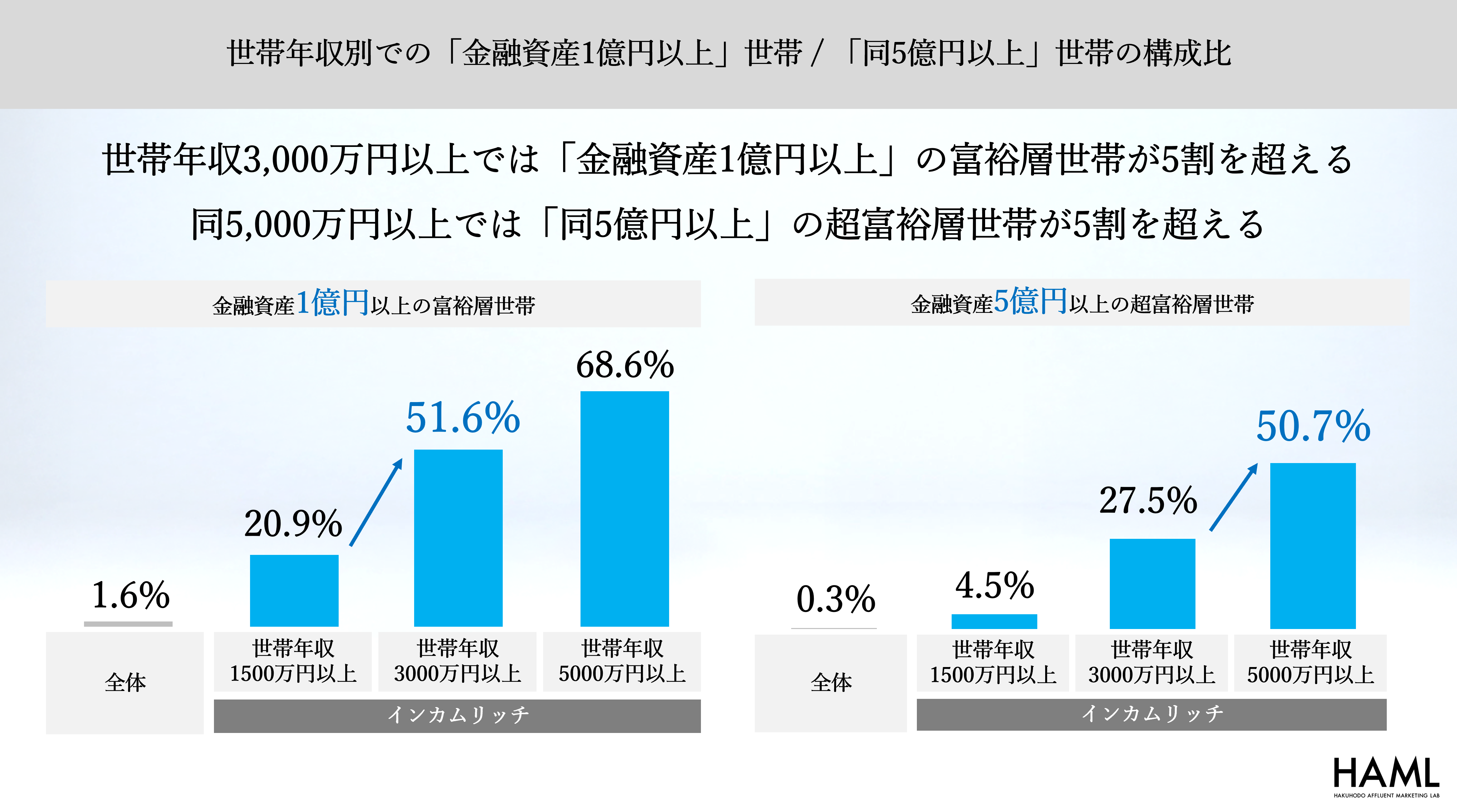今回の調査を通じて「世帯年収3,000万円」が所得富裕層(インカムリッチ)と資産富裕層(ウェルスリッチ)の両面を併せ持つ「超インカムリッチ」の分岐点であることが見えてきました。世帯年収5,000万円以上では金融資産5億円以上の「超富裕層」が実に5割を占める結果となりました。