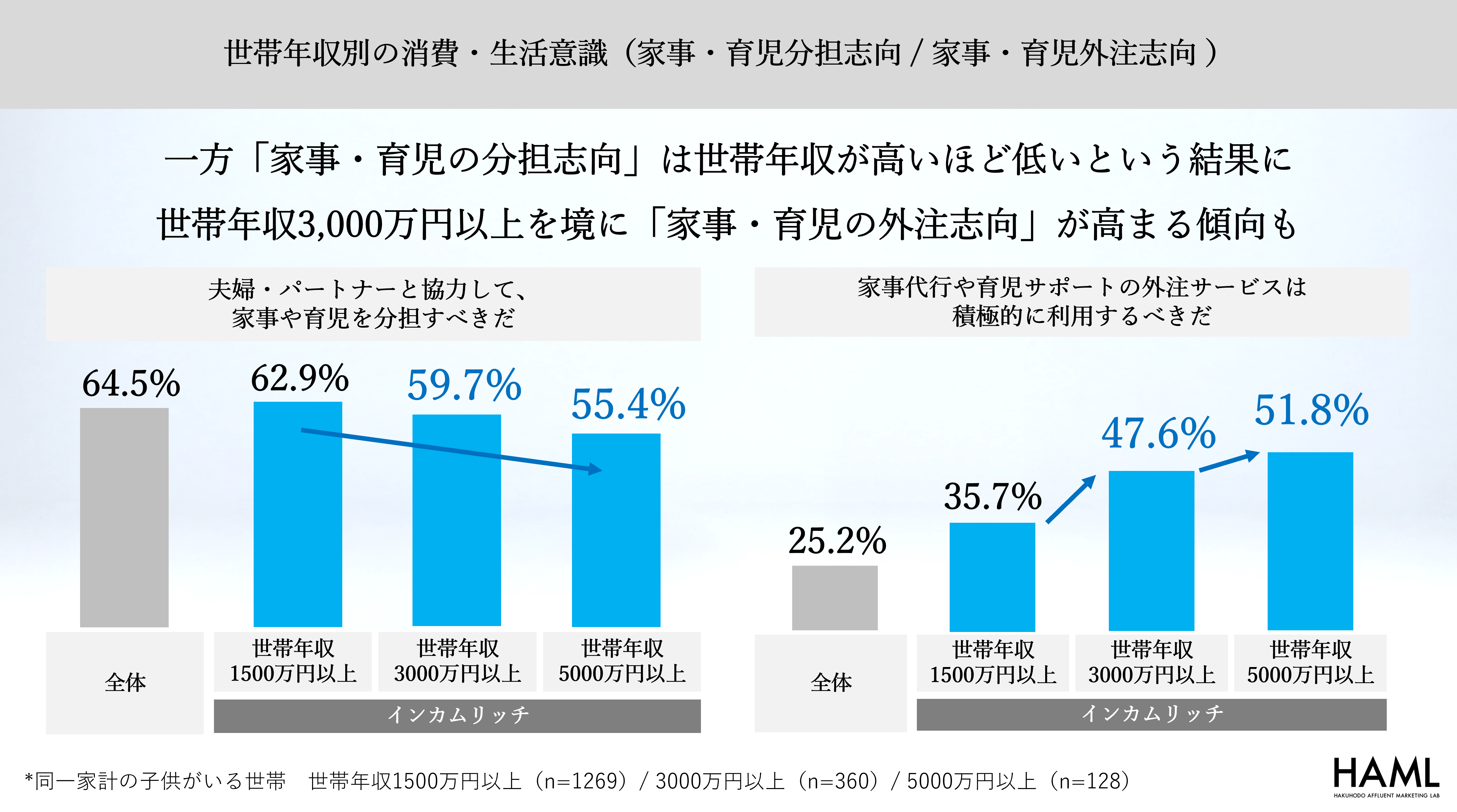 ■一方、「家事・育児の分担志向」は世帯年収が高いほど低いという結果に。世帯年収3,000万円以上を境に「家事・育児の外注志向」が高まる傾向も。