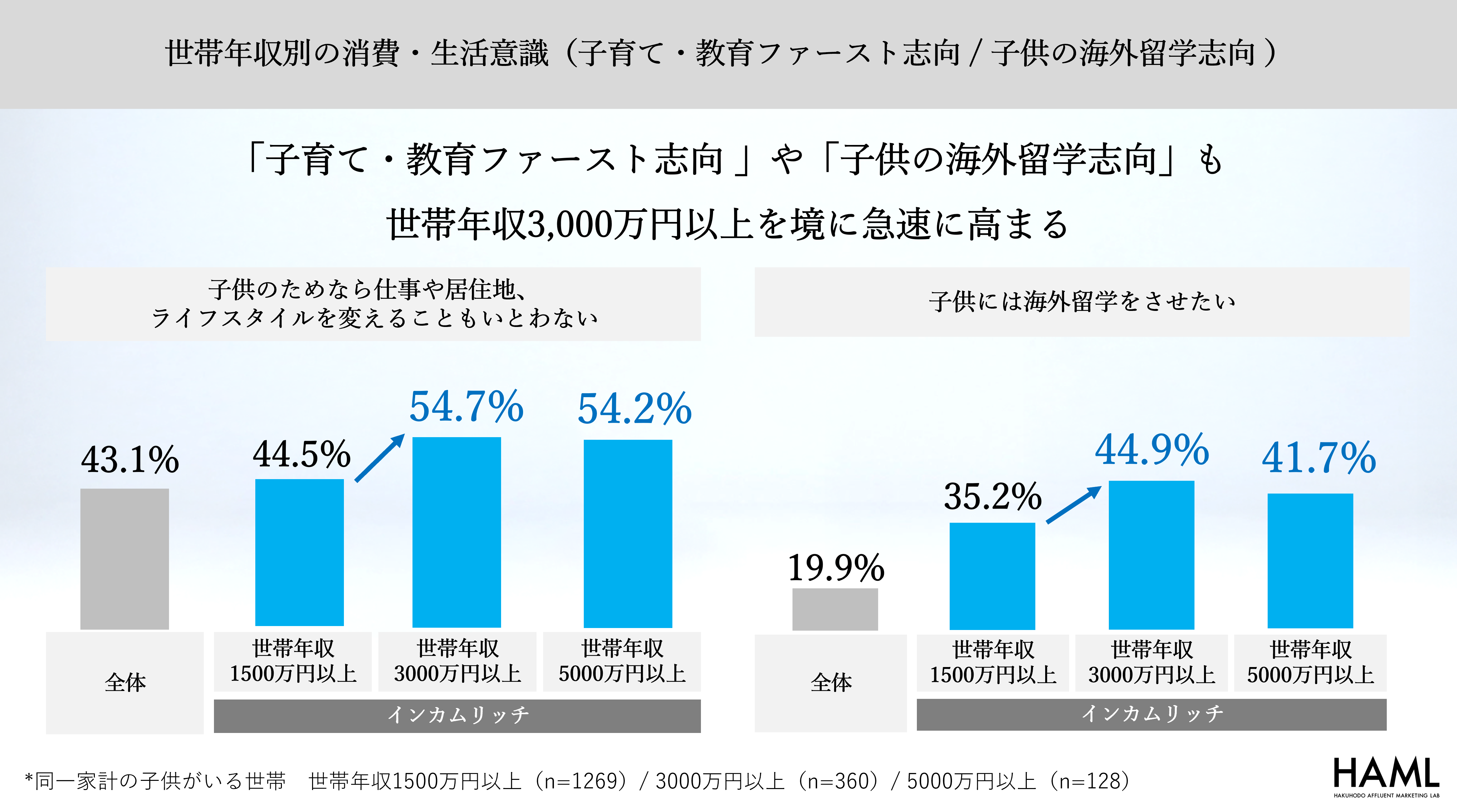 - 「子育て・教育ファースト志向」や「子供の海外留学志向」も世帯年収3,000万円以上を境に高まる傾向が見られた。
