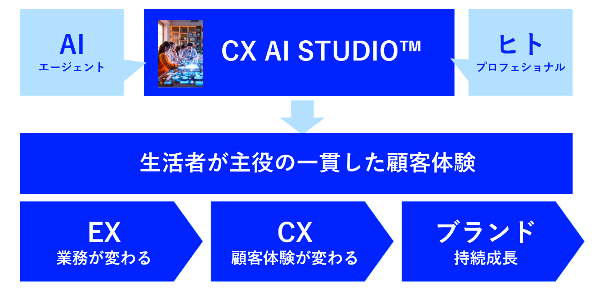 『CX AI STUDIO™』は、上記のような顧客体験向上における課題を解決するために開発された、専門スキルを持った“AIチームメイト”と一緒に働くための特別な仕事場“ワークプレイス”です。エージェントAIとの共創を通じて、従業員の体験価値(EX)向上を起点に、顧客発想・接点の統合化・データ連携を通して顧客体験価値(CX)を高め、ブランドの持続的成長を支援します。