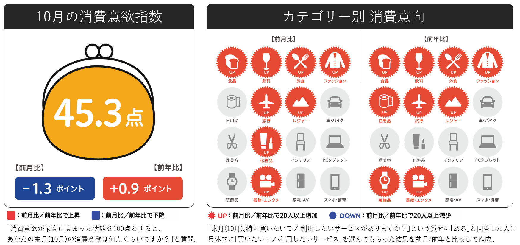2025年10月の消費意欲指数は45.3点。前月比では-1.3ptと低下し、前年比では+0.9ptとやや上昇しました。