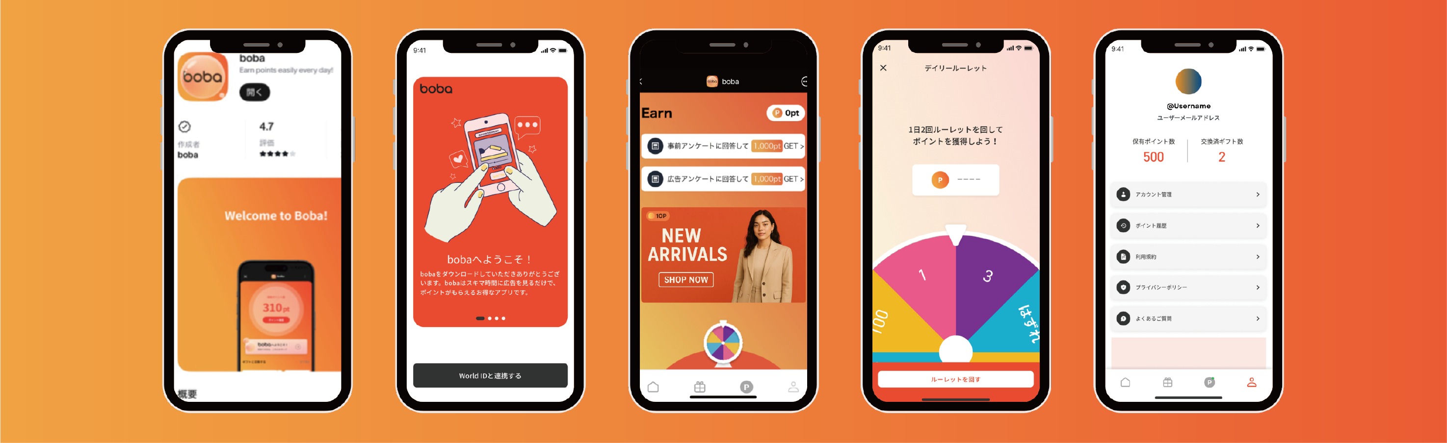 本実証実験では、World IDの認証機能とポイントインセンティブ機能を統合した独自のミニアプリ「boba」が活用されました。ユーザーは以下のフローで広告を体験しました。