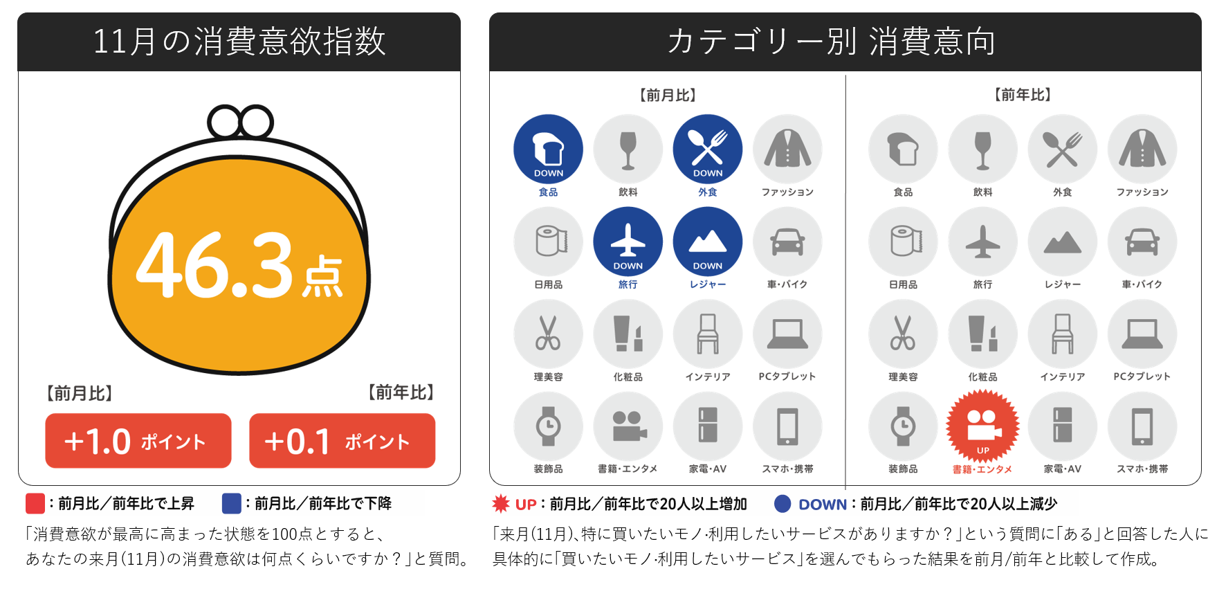 2025年11月の消費意欲指数は46.3点。前月比では+1.0ptと上昇し、前年比では+0.1ptで横ばいとなりました。