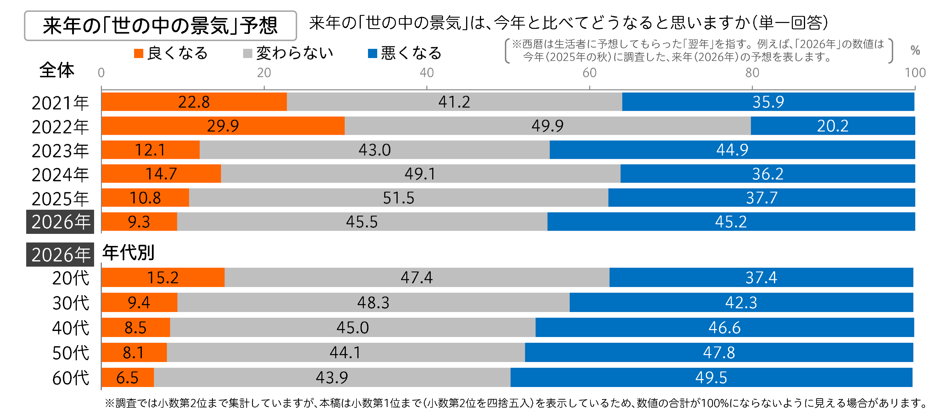 2026年の景況感 来年の景気予想は「悪くなる」が増加。上の年代ほど「悪くなる」が高くなる傾向