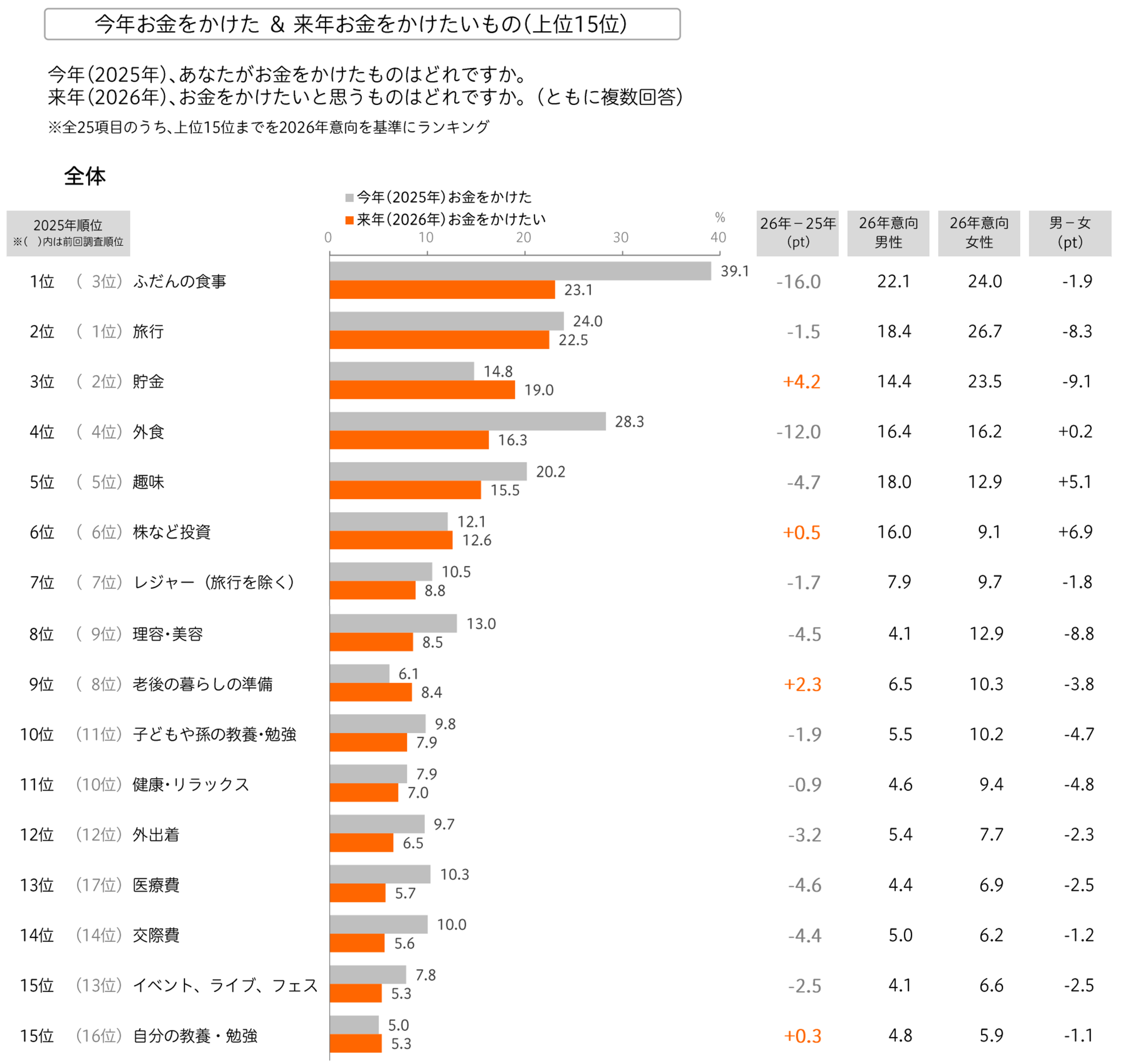 2026年にお金をかけたいこと 1位「ふだんの食事」、2位「旅行」、3位「貯金」。「貯金」などでは「今年お金をかけた」を上回る