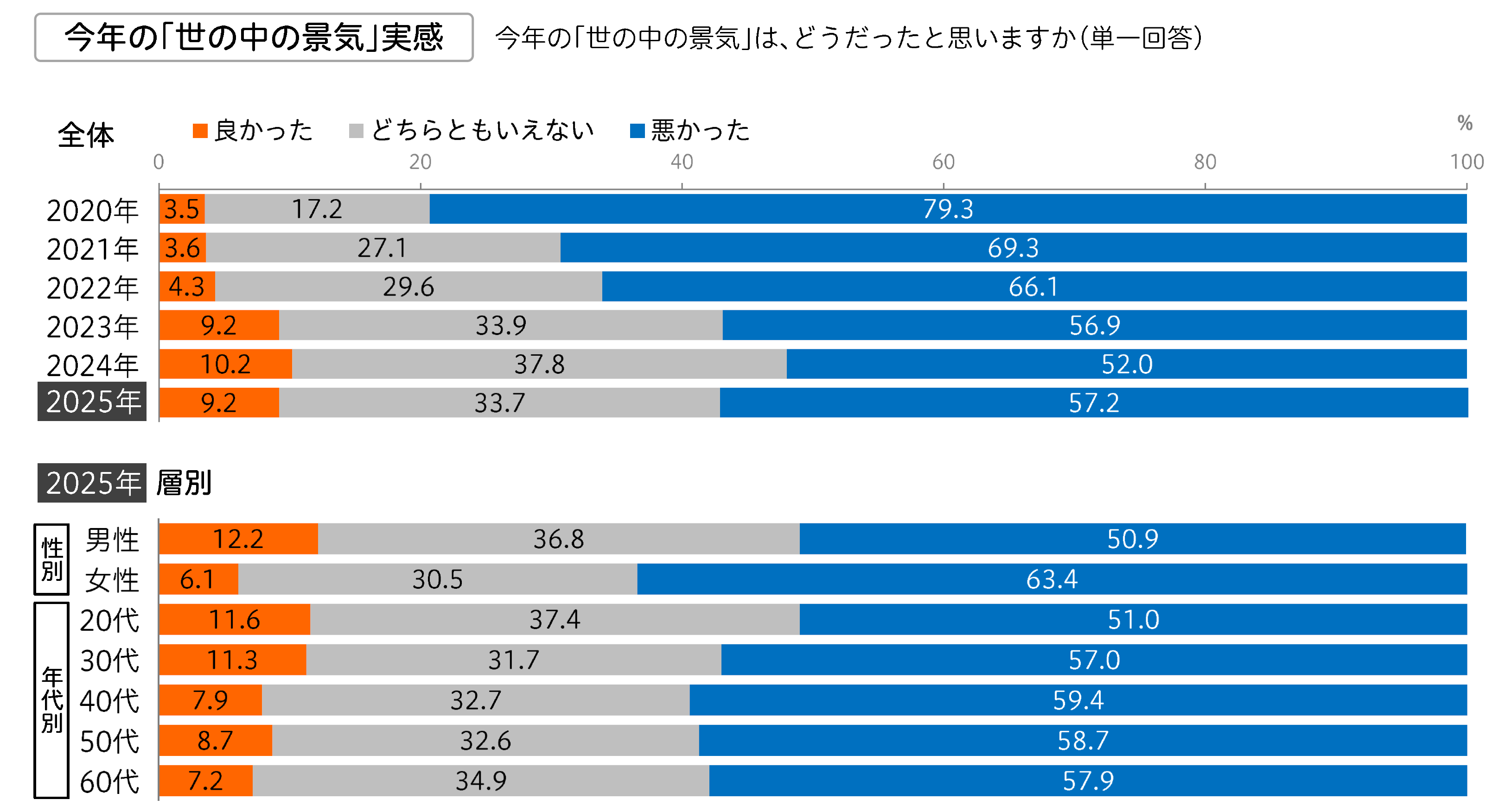 - 今年の「世の中の景気」実感は、「悪かった」が57.2%と、前回調査(52.0%)より+5.2ptとなり、前回までの減少傾向から転じて増加。 性別でみると、特に女性では、「悪かった」が63.4%と、男性(50.9%)に比べて、10pt以上高いスコアとなっています。