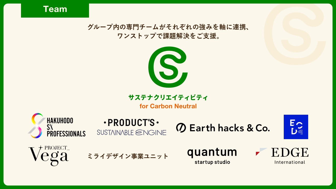 「博報堂SXプロフェッショナルズ」「博報堂プロダクツ サステナブルエンジン」「Earth hacks」「地球中心デザイン研究所」「PROJECT_Vega」「ミライデザイン事業ユニット」「quantum」「エッジ・インターナショナル」など、サステナビリティ領域における各分野の専門性を持つグループ会社および専門組織等が連携し、戦略策定から社会実装まで支援します。