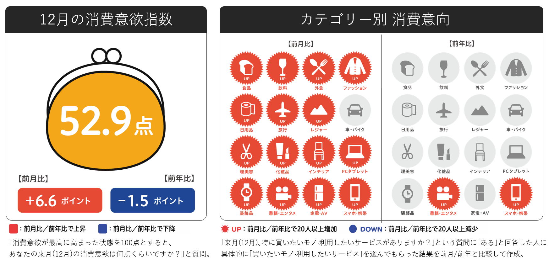 クリスマスや忘年会、お正月といったイベントに向け、前月より幅広いカテゴリーで消費意向が高まりそうです。