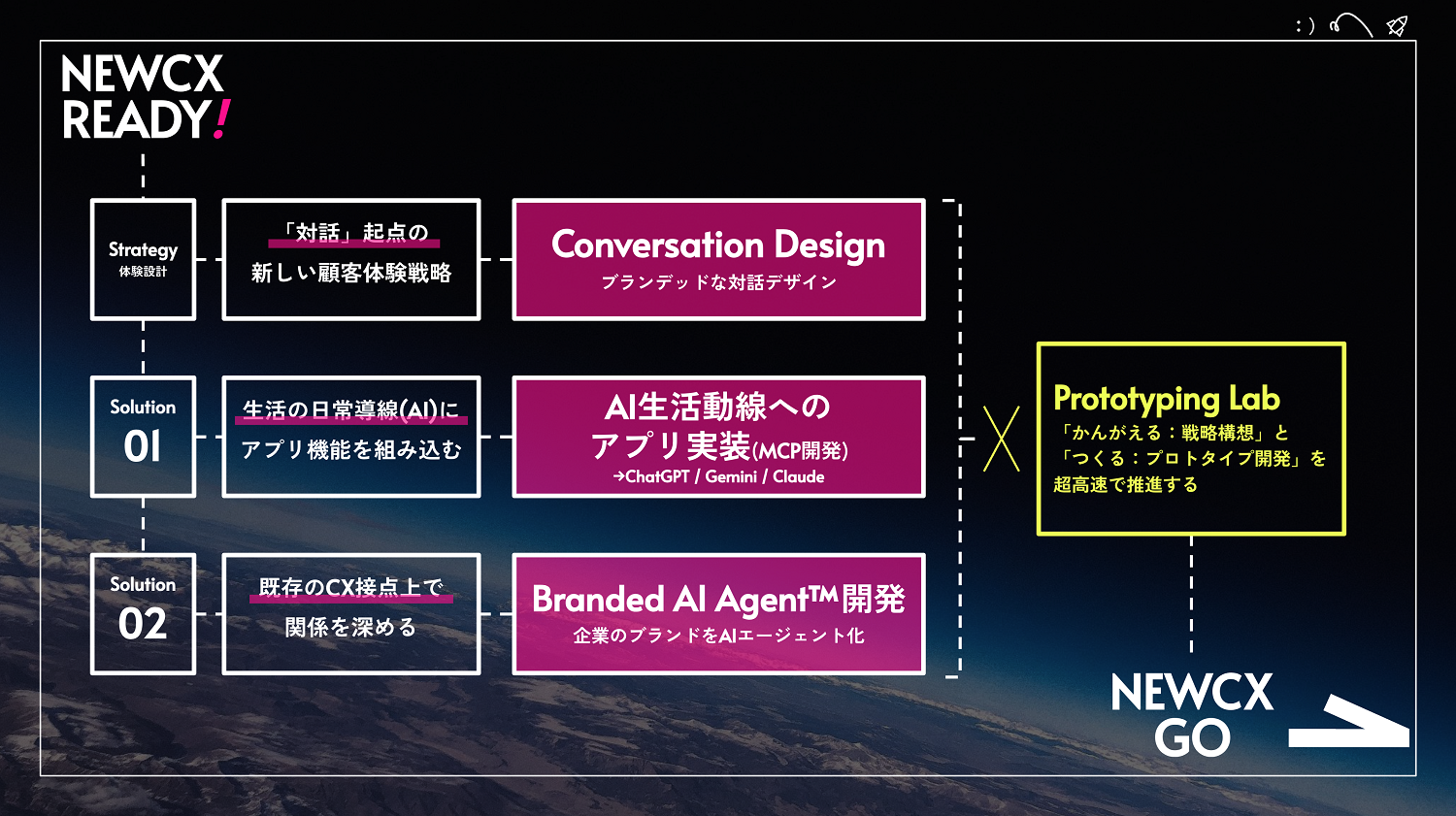 アプリ開発を中心としたデジタル生活接点/顧客体験の変革業務をおこなうHAKUHODO BRIDGEが博報堂・アイリッジと共同で新たに提供する 「NEW CX READY」では、AI時代の “次世代顧客体験”の社会実装に向け、日常導線となりつつある「OSとしてのAIプラットフォーム(ChatGPT / Gemini / Claude等)」上で既存アプリの機能を利用可能にする「AIエージェント連携プロトコルの開発」や、ブランドのAIエージェント化を実現する「Branded AI Agent™開発」について、構想を机上の空論 で終わらせない超高速の「プロトタイプ開発支援」を起点に実装支援します。生活者との新たな顧客接点づくりから、深く継続的な関係構築まで一気通貫で支援いたします。