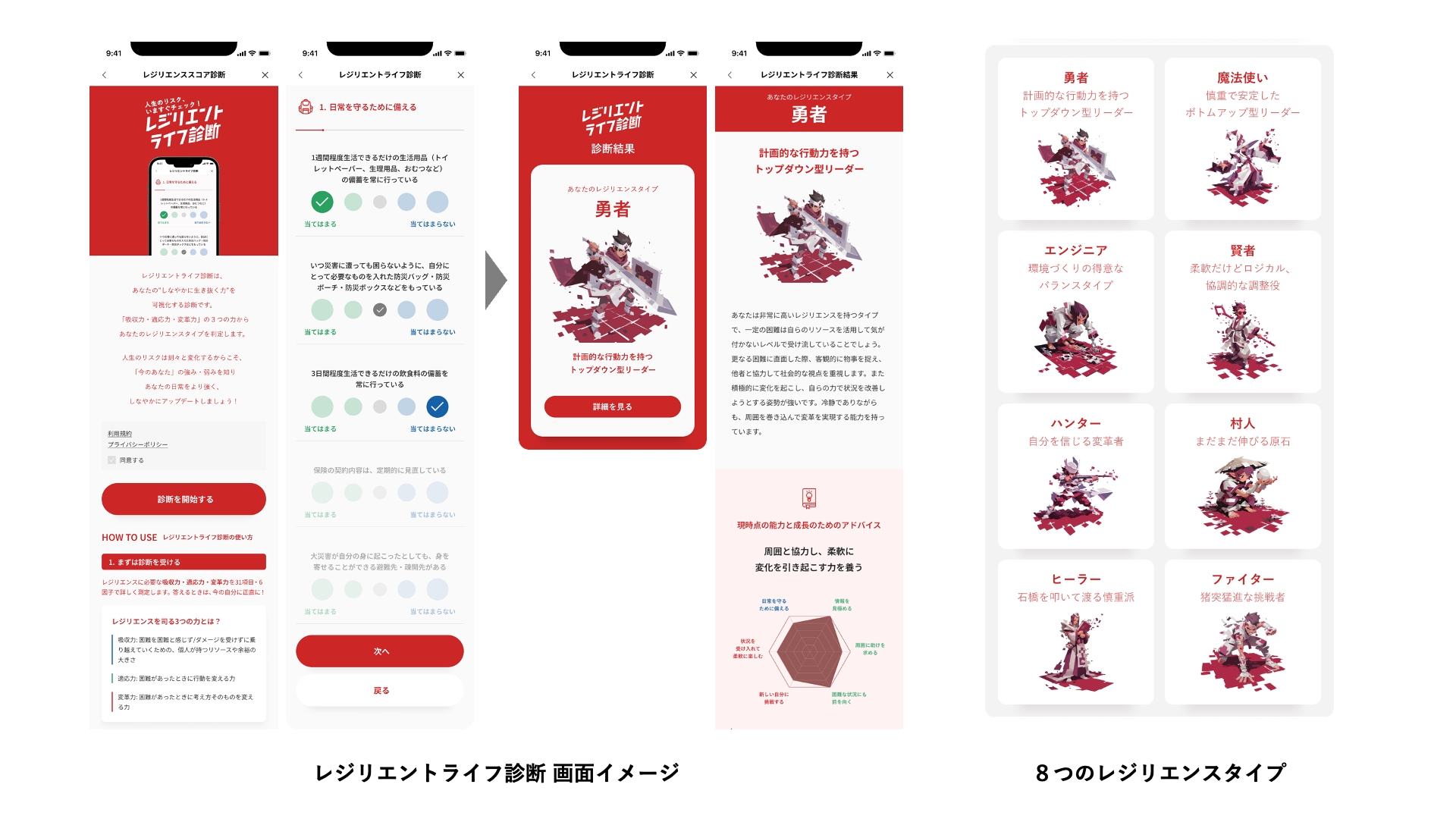 31の質問に回答することで、個人のレジリエンス能力を「吸収力」「適応力」「変革力」の3つの組み合わせで判定。結果に応じて「勇者」「魔法使い」「賢者」といった8つのレジリエンスタイプに分類し 、強みや補うべきアクションを分かりやすく可視化します。