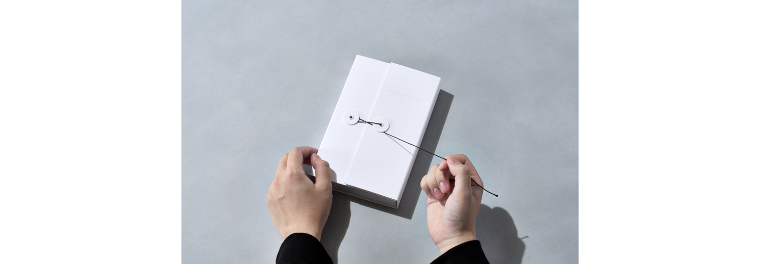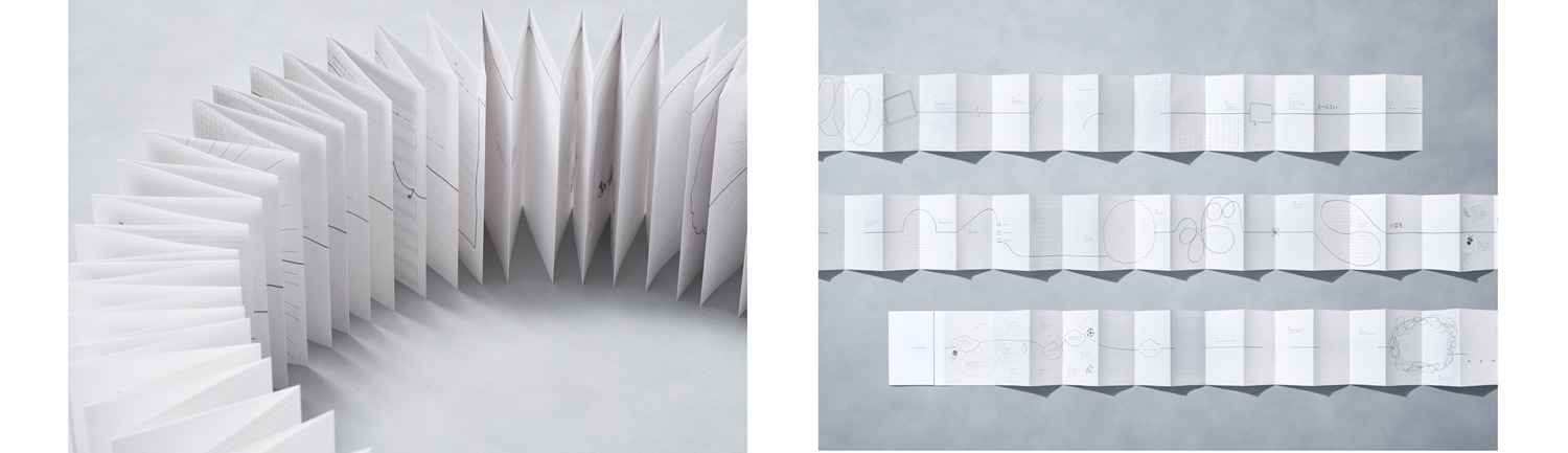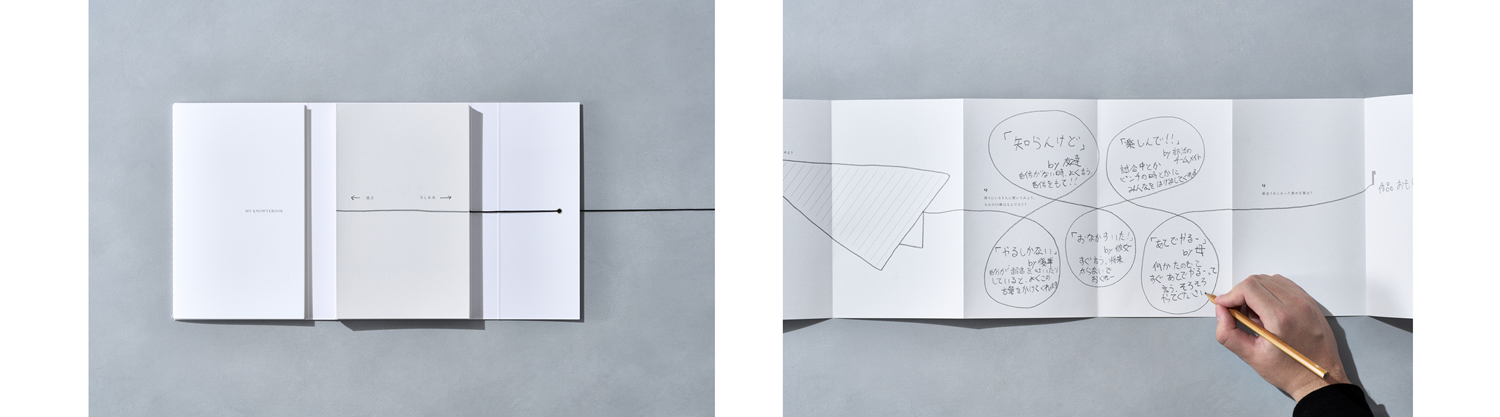 中面は、一般的な背開き型ではなく、1枚の紙を折りたたんだ蛇腹折り構造(アコーディオン型)を採用。これまでの人生経験が、すべて今の自分に繋がっていることを表現しています。また、各ページデザインには1本の線が描かれており、本を紐解く際に触った紐が最後のページまでずっと繋がるようにデザインをしています。