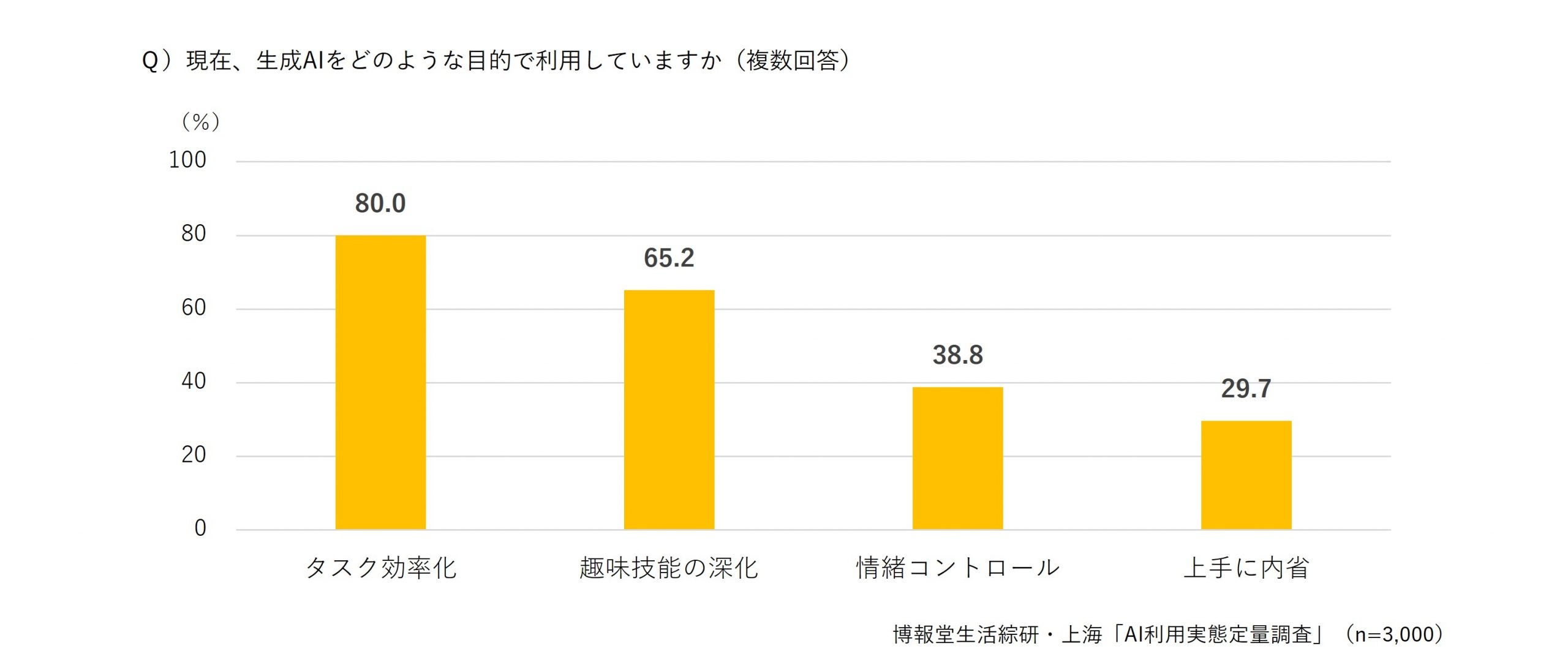 ・AI利用者に、各目的のために現在AIをどの程度活用しているのかを複数回答できいたところ、「タスク効率化」が80.0%と最も高く、次いで「趣味技能の深化」が65.2%となりました。(データ4)