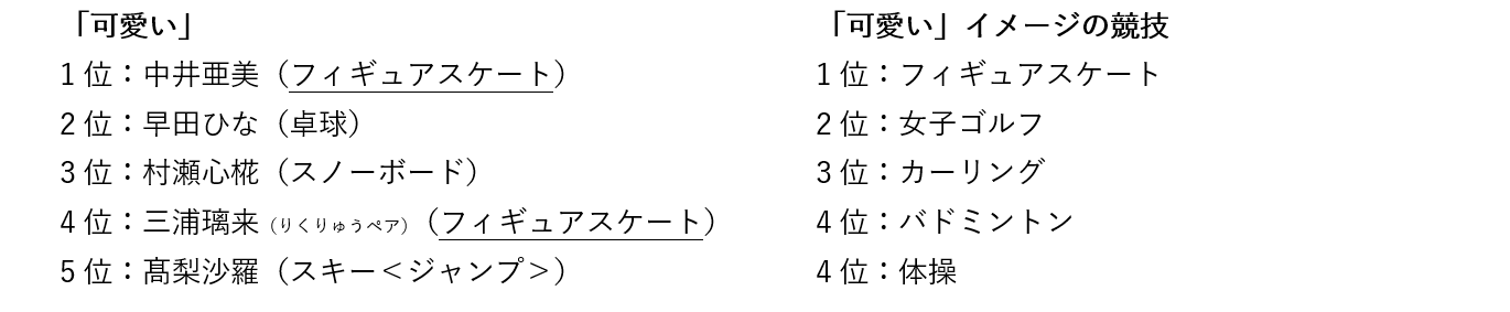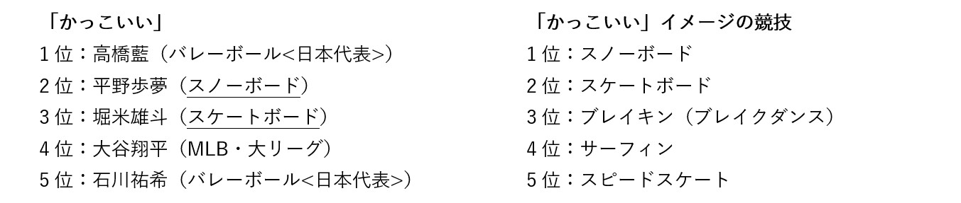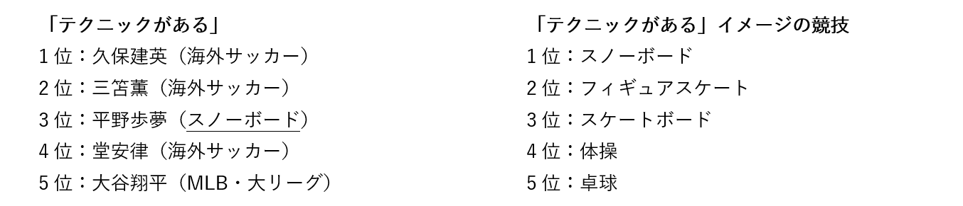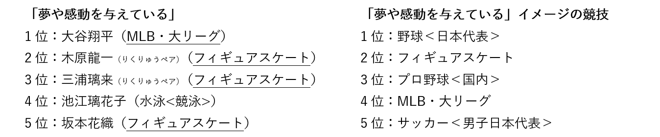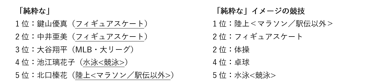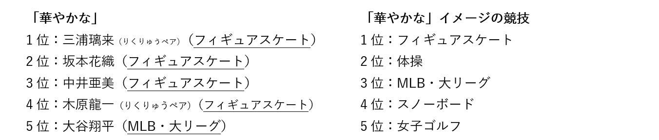 個別イメージでは、「純粋な」アスリートは、1位:鍵山優真(フィギュアスケート)、2位:中井亜美(フィギュアスケート)、3位:大谷翔平(MLB・大リーグ)、4位:池江璃花子(水泳<競泳>)、5位:北口榛花(陸上<マラソン/駅伝以外>)となりました。「華やかな」アスリートは、1位:三浦璃来(りくりゅうペア)(フィギュアスケート)、2位:坂本花織(フィギュアスケート)、3位:中井亜美(フィギュアスケート)、4位:木原龍一(りくりゅうペア)(フィギュアスケート)、5位:大谷翔平(MLB・大リーグ)とミラノ・コルティナ2026冬季オリンピックに出場していたフィギュアスケート選手が上位となりました。