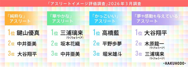 株式会社博報堂は、株式会社博報堂DYスポーツマーケティング、データスタジアム株式会社と共同で、2026年2月27日~3月2日に、アスリートの総合的なイメージを測定する「アスリートイメージ評価調査」2026年3月調査を行いました。