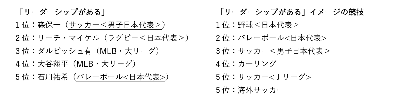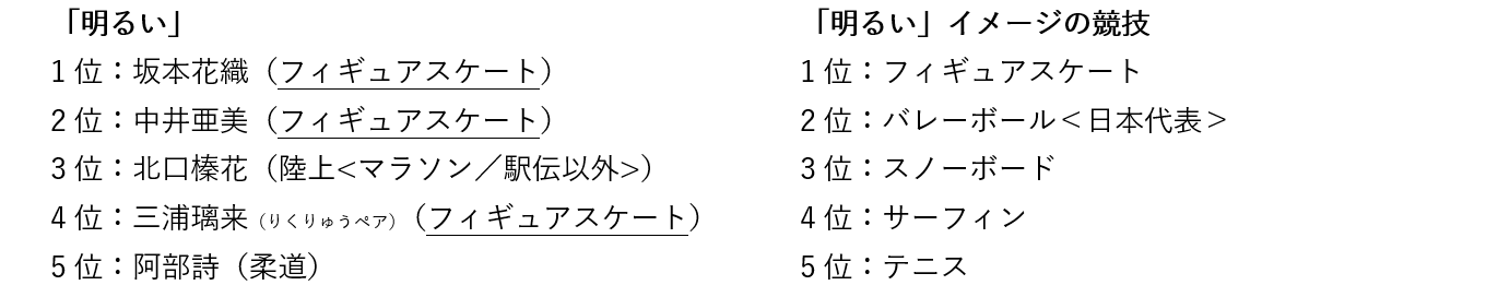 競技についても上位5競技のランキングを作成いたしました。個別イメージから見た「アスリート」と「競技」を比較することで、共通して上位に挙がっているものは下線を引いています。競技イメージとアスリートイメージで共通性があるものは相乗関係があるイメージ、共通性がないものはアスリートが独自に持つ固有のイメージとして捉えています。