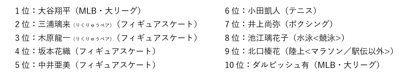 アスリートイメージ総合ランキングは、1位:大谷翔平(MLB<大リーグ>)、2位:三浦璃来(りくりゅうペア)(フィギュアスケート)、3位:木原龍一(りくりゅうペア)(フィギュアスケート)、4位:坂本花織(フィギュアスケート)、5位:中井亜美(フィギュアスケート)となりました。
