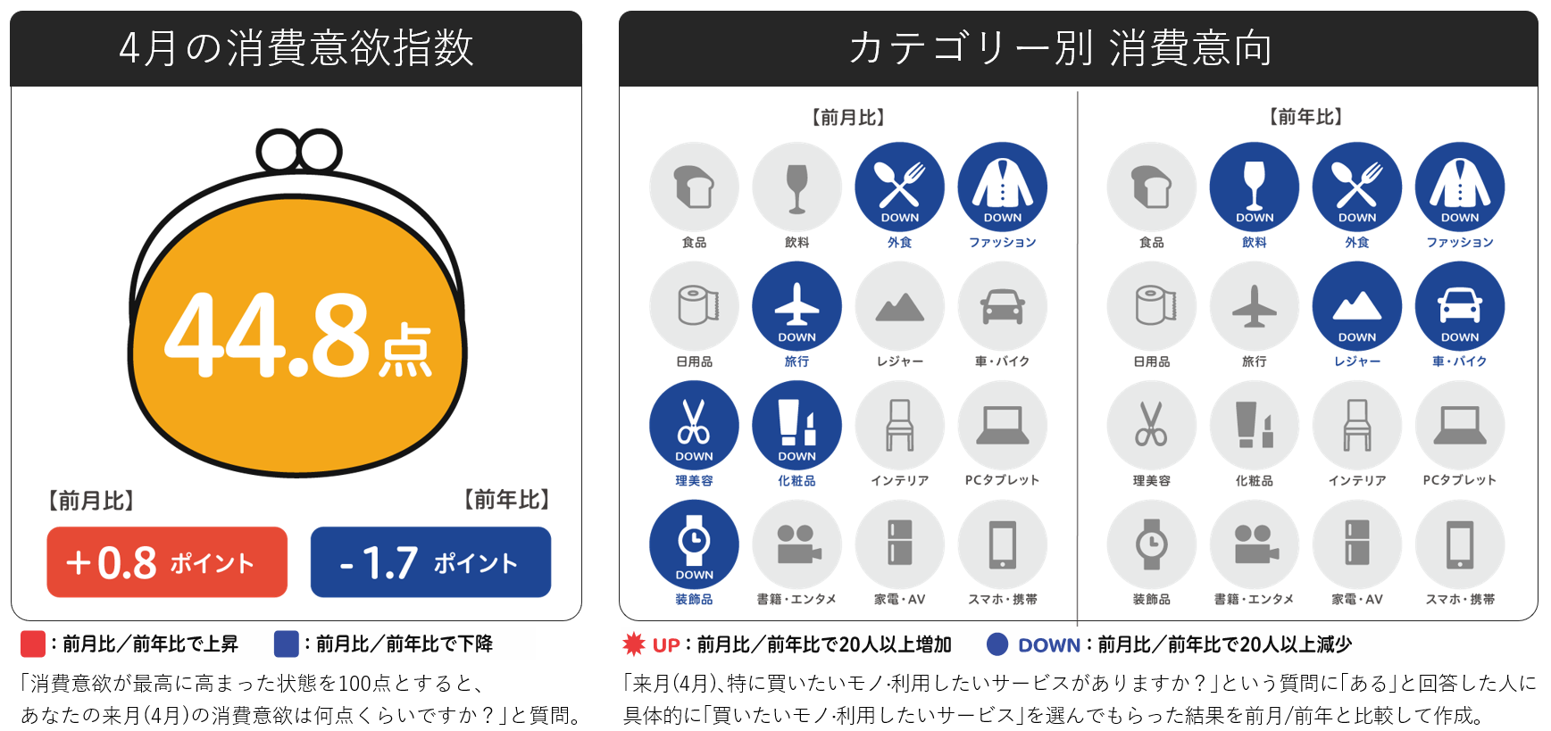 2026年4月の消費意欲指数は44.8点。前月比では+0.8ptとやや上昇し、前年比では-1.7ptと低下しました。