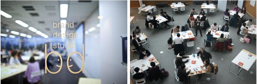 ブランドデザインスタジオの教室(左)と実際の授業の様子(右)(ブランドデザインスタジオ公式HPより)。