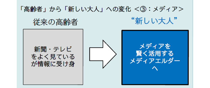 従来の高齢者といえば、「新聞」「テレビ」をよく見ているが、情報に受動的なのが一般的なイメージでした。それがこの8年で「テレビ」「新聞」「デジタル」を、使用用途に分けて積極的に活用する、“メディアエルダー”へと変化しています。