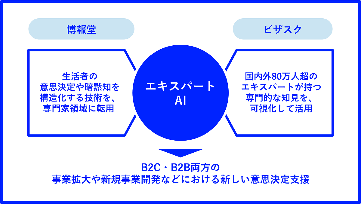 このたびの資本業務提携では、新規事業開発や市場参入・マーケティング戦略立案に取り組む企業の担当者に向けて、ビザスクのエキスパートが持つ業界特有の常識や視点と、博報堂が培ってきた意思決定の思考構造化のノウハウおよびAIエンジンを組み合わせたAIサービス「エキスパートAI」を共同開発します。