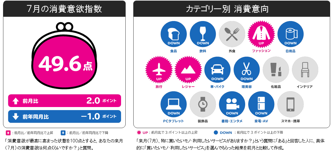 7月の消費意欲指数は49.6点。前月比+2.0ポイント。低調が続いていた消費意欲指数ですが、今月は例年の7月と同様に50点近い数値となり、2016年では1月に次ぐ高い結果となっています。